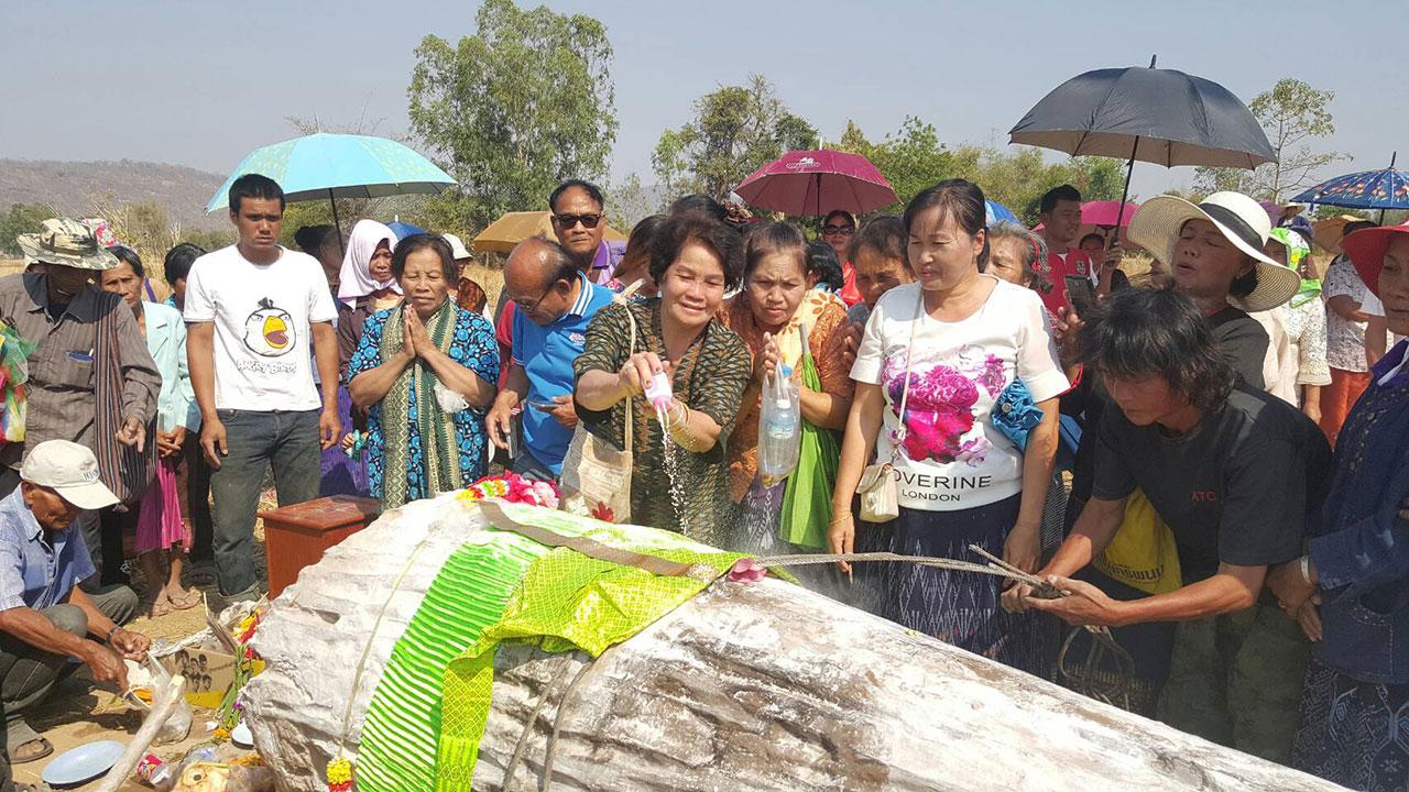 พระสงฆ์ศรีโพธิ์ทอง และชาวบ้านมุกดาหาร ร่วมกันทำพิธีอัญเชิญต้นตะเคียนทองอายุ 300 ปี หนัก 3 ตัน เคลื่อนย้ายเก็บรักษาที่วัดแล้ว หลังขุดพบขณะลอกลำห้วย คอหวยไม่พลาด โรยแป้งขูดเลขขอโชค