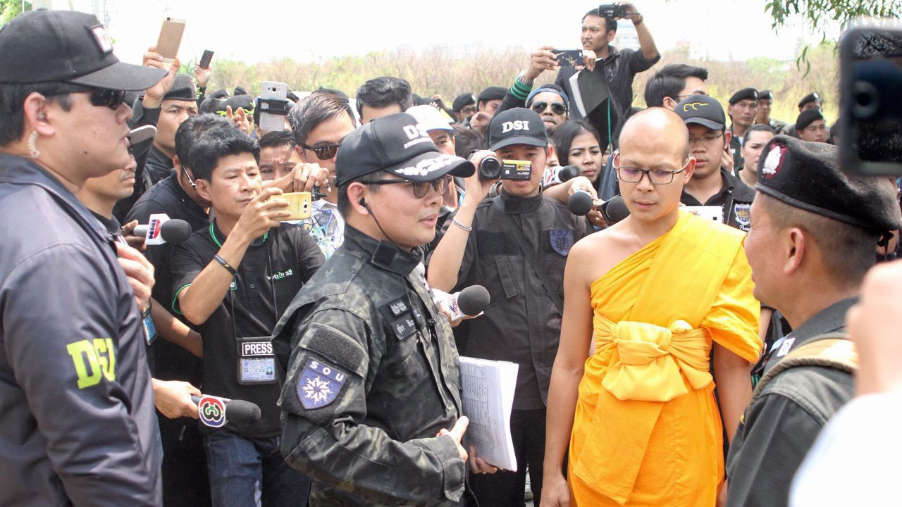 เจ้าหน้าที่ดีเอสไอเจรจากับพระสนิทวงศ์ วุฑฒิวังโส ผอ.ฝ่ายสื่อสารองค์กร วัดพระธรรมกาย หลังเกิดเหตุพระและศิษย์วัดพระธรรมกายปะทะกับตำรวจควบคุมฝูงชนจนเจ็บทั้ง 2 ฝ่าย ตกลงใช้แผงเหล็กกั้นทั้ง 2 ฝ่ายออกจากกัน.