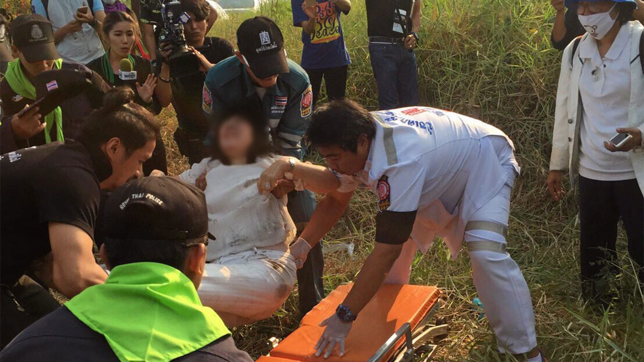 ตำรวจและเจ้าหน้าที่พยาบาลช่วยกันยกร่างลูกศิษย์วัดพระธรรมกายขึ้นเปลไปส่งโรงพยาบาล หลังพระสงฆ์และศิษย์วัดพระธรรมกายปะทะกับตำรวจควบคุมฝูงชน บริเวณทางเข้าปากคลองแอน ทางเข้าประตู 5 และประตู 6.