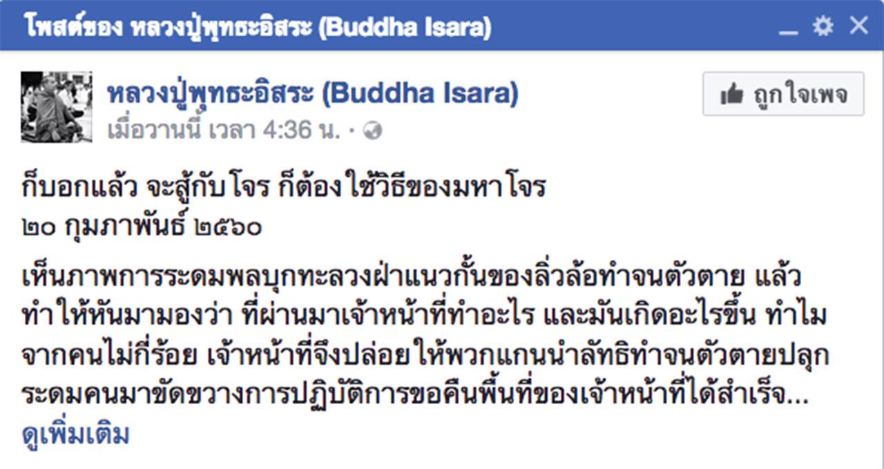 ก่อนหน้านี้ มีความเคลื่อนไหวจากด้านหลวงปู่พุทธะอิสระ เมื่อวันที่ 20 ก.พ.2560 โดยได้โพสต์เฟซบุ๊ก (Buddha Isara) ระบุถึงการวิเคราะห์กระบวนการทำงานของเจ้าหน้าที่ดีเอสไอในช่วง 5 วันที่ผ่านมา และแผนการรับมือของฝั่งวัดพระธรรมกาย แบบวันต่อวัน ฉากต่อฉาก รวมถึงเสนอความเห็นในการจัดการปัญหาม็อบลากยาว แก่ทางดีเอสไอในกรณีเหตุการณ์นี้ด้วย