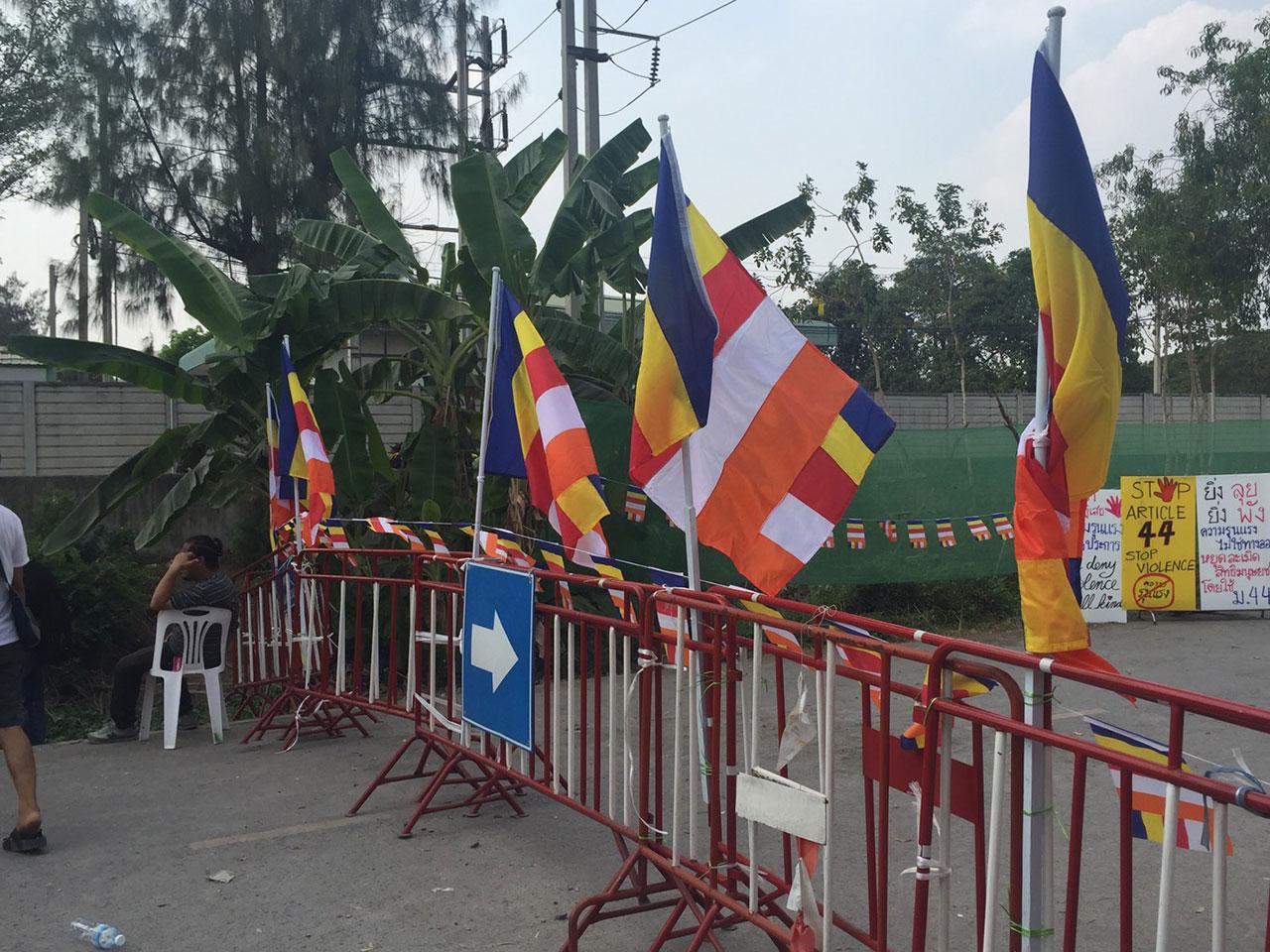 ขณะที่ บริเวณเขตวัดธรรมกายมีการติดธงฉัพพรรณรังสี อันเป็นธงพุทธศาสนาสากลแปลว่ารัศมี 6 สี ซึ่งกล่าวกันว่าแผ่ออกจากพระกายของพระพุทธเจ้า คือ