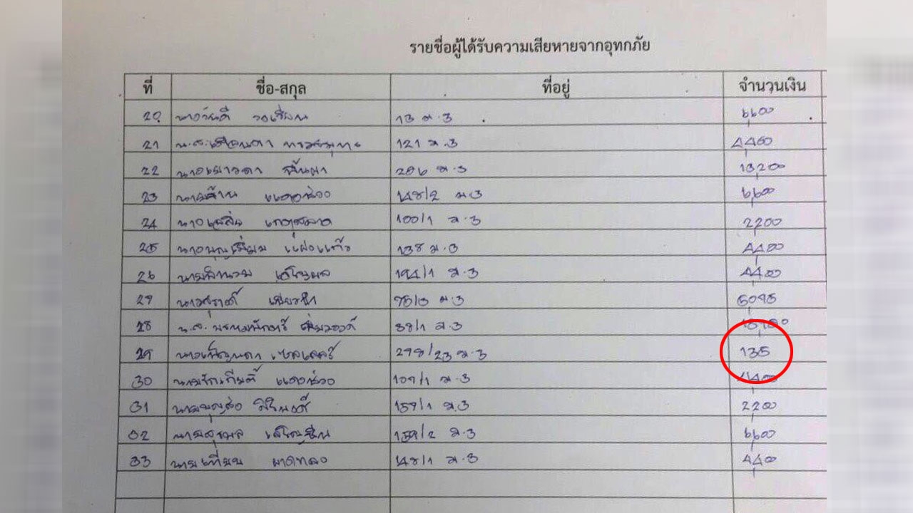 วันที่ 21 ก.พ. นายศักรินทร์ ทุมเสน นายอำเภอบางสะพาน จ.ประจวบคีรีขันธ์ เปิดเผยว่า จากกรณีที่มีข้อสงสัยจากการสรุปข้อมูลและจัดส่งรายงานการช่วยเหลือ เยียวยาผู้ประสบภัยน้ำท่วมของทางเทศบาลตำบลบ้านกรูด ในส่วนของหมู่ 2, 3, 4, 6 บางส่วนแล้วเสร็จ จำนวน 133 หลัง (หนังสือเลขที่ ปข 52801/106) ซึ่งมีบางหลังได้รับเงินช่วยเหลือ 135 บาท และ 981 บาทนั้น