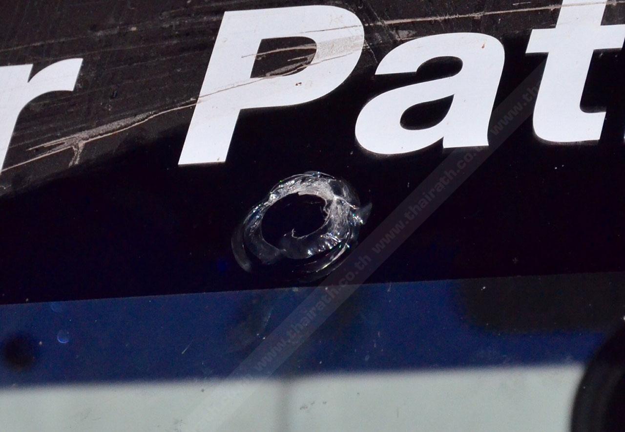 รถหกล้อ ตชด.บรรทุกกำลังพล พร้อมสัมภาระ ถูกมือดีปาหินจนกระจกแตก ก่อนถึงจุดเปลี่ยนกำลัง ถนนเลียบคลองแอน ประมาณ 300 เมตร โชคดีไม่มีผู้ได้รับบาดเจ็บ...