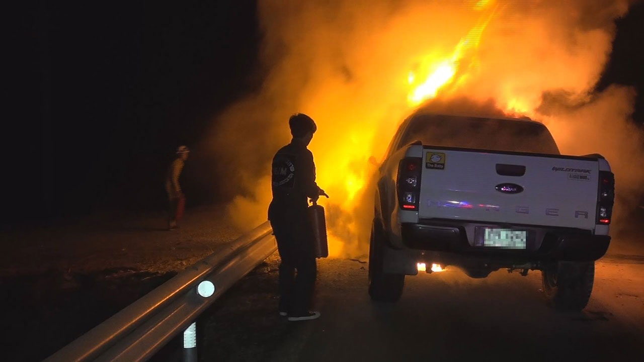 ตร.กำแพงเพชร รับแจ้งไฟไหม้รถกระบะฟอร์ด เรนเจอร์ ริมถนน ใช้เวลาดับไฟนาน 20 นาที รถพังเสียหายทั้งคัน ไร้เงาคนขับ เปิดกล้องวงจรปิดภาพพบประกายไฟออกมาจากล้อด้านขวา แถมมีรอยเหมือนถูกชนหรือกระแทกมาด้วย