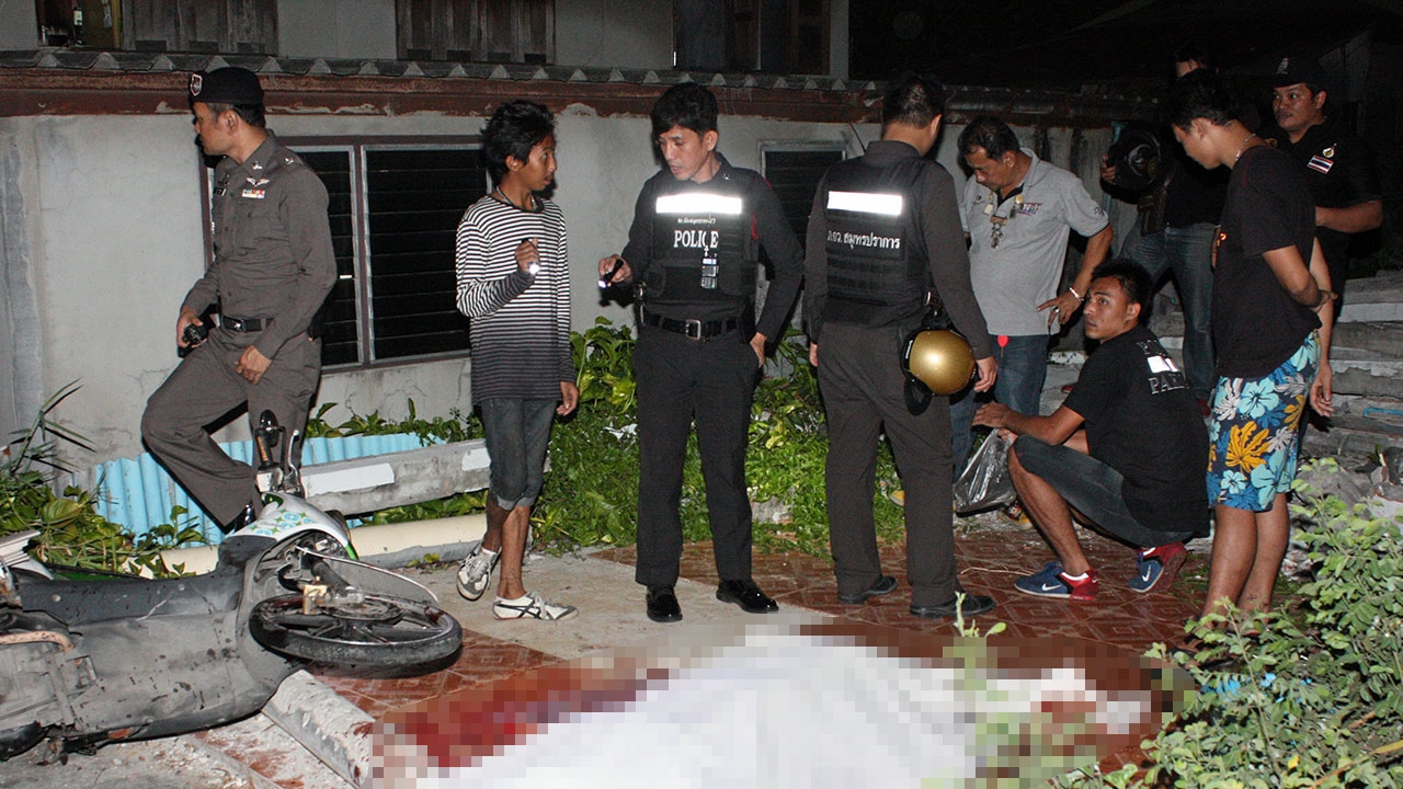 พบศพนายสนั่น จีนเจริญ อายุ 43 ปี คนงานก่อสร้าง อยู่บ้านเลขที่ 25 ชุมชนดังกล่าว ห่างจุดเกิดเหตุราว 20 เมตร สวมกางเกงขาสั้น ไม่สวมเสื้อ นอนหงายจมเลือดบนพื้นทางเดิน มีบาดแผลถูกแทงด้วยของมีคมใบหน้าซีกซ้ายหลายแผล คิ้วซ้าย 2 แผล และต้นคอด้านหลัง 1 แผล และถูกเชือดคอด้วยของมีคม 2 แผลฉกรรจ์ มีเศษขวดเบียร์แตกกระจายเกลื่อนพื้น ส่วนคนร้ายชื่อนายณัฐภรณ์ ยาน้ำทอง อายุ 19 ปี มีศักดิ์เป็นหลานผู้ตาย เนื่องจากแม่นายณัฐภรณ์เป็นน้องภรรยาผู้ตาย พบบาดแผลถูกบาดข้อมือขวา มีผู้นำส่ง รพ.สมุทรปราการ ไปก่อนแล้ว
