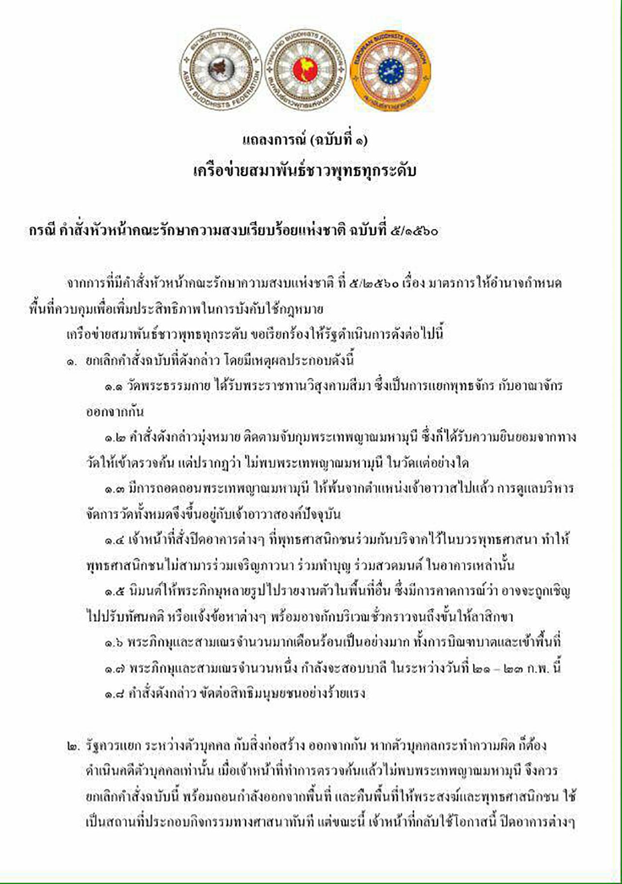 ขณะที่วานนี้ (21 ก.พ.) เครือข่ายสมาพันธ์ชาวพุทธทุกระดับ 53 องค์กร ออกแถลงการณ์ ฉบับที่ 1 จี้รัฐยกเลิกการใช้มาตรา 44 คืนพื้นที่ให้พระและประชาชนของวัดพระธรรมกาย