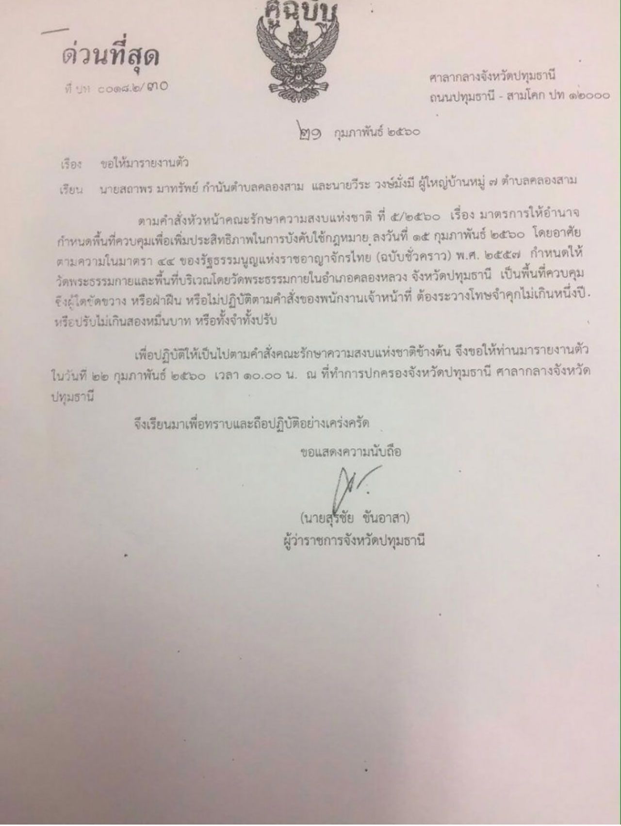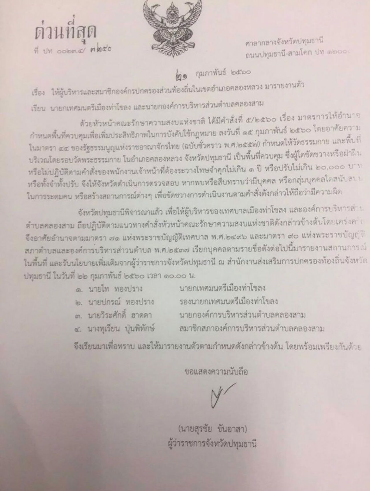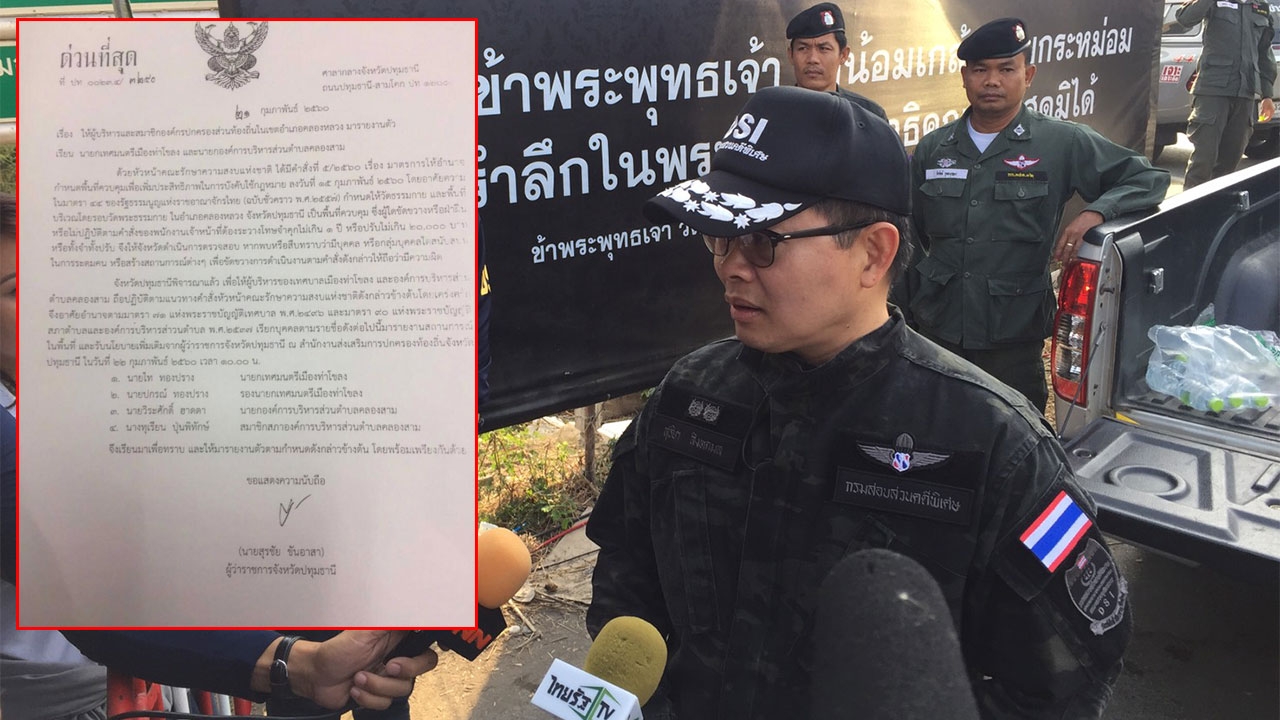 ด้าน นายสุรชัย ขันอาสา ผู้ว่าราชการจังหวัดปทุมธานี อ้างคำสั่งมาตรา 44 เรียกนักการเมืองท้องถิ่น ต.คลองสาม อ.ท่าโขลง 4 ราย เข้ารายงานตัวเพื่อทำความเข้าใจบทลงโทษกรณีขัดขวางการปฏิบัติหน้าที่ใต้ ม.44