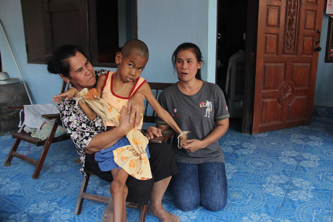 นางบุญเรียม เล่าว่า ตอนท้องน้องเฟรม ตลอด 9 เดือน มีอาการปกติ แต่เมื่อถึงเวลาคลอดก็ไปที่ รพ.อุตรดิตถ์ กลับไม่สามารถคลอดปกติได้ รพ.อุตรดิตถ์ ต้องใช้เครื่องดูดเด็กออกมา ทำให้ น้องเฟรม ต้องเข้าห้องไอซียูเด็กหลายสัปดาห์ แพทย์บอกว่าขาดออกซิเจนนานเกินไป การพัฒนาจะช้าว่าเด็กทั่วไป หลังกลับมาอยู่บ้านแพทย์แนะนำให้ไปกายภาพบำบัดที่ รพ. ตั้งแต่อายุ 2 เดือน จนถึง 3 ขวบ ก็ยังเดินไม่ได้ จึงหยุดพาไปทำกายภาพบำบัด เพราะครอบครัวมีปัญหาเรื่องค่าใช้จ่าย ปัจจุบันตนทำงานรับจ้างมีรายได้วันละ 300 บาท หากวันไหนลางานก็จะถูกหักค่าแรง ขณะนี้ น้องเฟรม อายุ 15 ปี ก็ยังไม่สามารถพูดหรือช่วยเหลือตัวเองได้ เนื่องจากกล้ามเนื้ออ่อนแรง แขนขาลีบเล็ก ต้องดูแลอย่างใกล้ชิด คอยอุ้ม ป้อนอาหาร พาเข้าห้องน้ำ แต่รับรู้ได้ทุกอย่าง เวลาอยากจะกินอะไรก็จะมองสิ่งที่อยากกิน