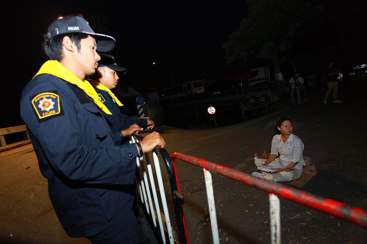 ส่วนบริเวณแผงรั้วกั้น ถนนเลียบคลองแอน หญิงวัย 45 ปี ยังคงนั่งประท้วงเจ้าหน้าที่ตำรวจ พร้อมกับนำป้ายมาเขียนวิงวอนเจ้าหน้าที่ตำรวจเปิดทางให้เข้าไปในคอนโดฯ ซึ่งอยู่ในรั้วของวัดธรรมกาย แต่ทางเจ้าหน้าที่ตำรวจไม่อนุญาต เนื่องจากที่อยู่ในบัตรประชาชนไม่ตรงกับคอนโดฯ ที่อ้าง