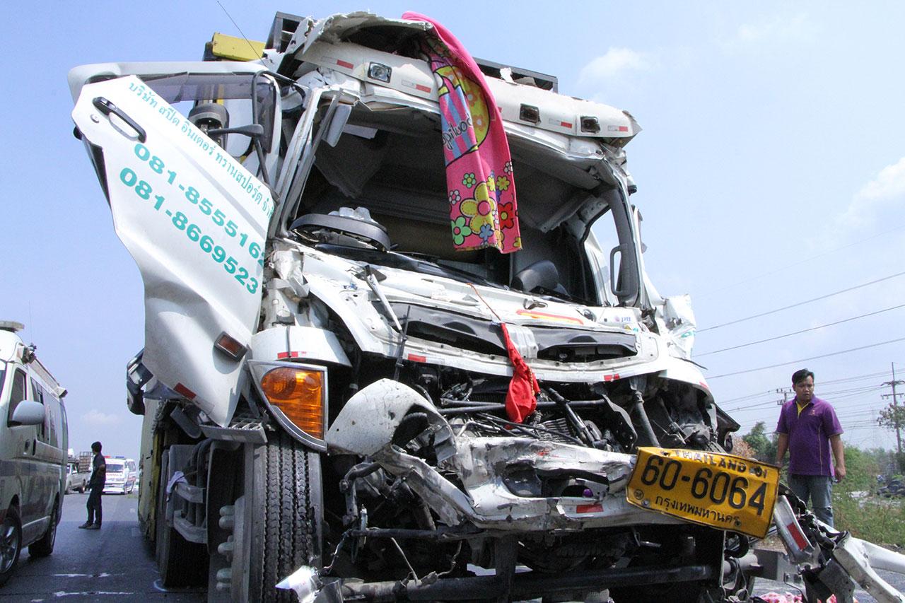 ที่เกิดเหตุพบรถพ่วง ยี่ห้อฮีโน่ สีขาว ลูกพ่วงสีเหลือง ขนส่งสินค้า หมายเลขทะเบียน 60 – 6064 กรุงเทพมหานคร ตัวลูกทะเบียน 70 – 6352 นนทบุรี พุ่งชนท้ายรถพ่วง ยี่ห้อฮีโน่ สีขาว บรรทุกทราย หมายเลขทะเบียนตัวแม่ 52 – 0318 กรุงเทพมหานคร ตัวลูกทะเบียน 52 – 0319 กรุงเทพมหานคร สภาพรถด้านหน้ารถขนส่งสินค้าพังยับเยิน รถยุบถึงห้องผู้โดยสาร คนขับติดภายในรถ เจ้าหน้าที่ต้องเร่งนำอุปกรณ์เครื่องตัดถ่างช่วยเหลือ ใช้เวลานานกว่า 30 นาที จึงนำผู้บาดเจ็บส่งโรงพยาบาลการุญเวชทราบชื่อคือ นายมนัส เอี่ยมจัด อายุ 39 ปี ซึ่งเป็นคนขับ อาการบาดเจ็บขาหักทั้ง 2 ข้าง