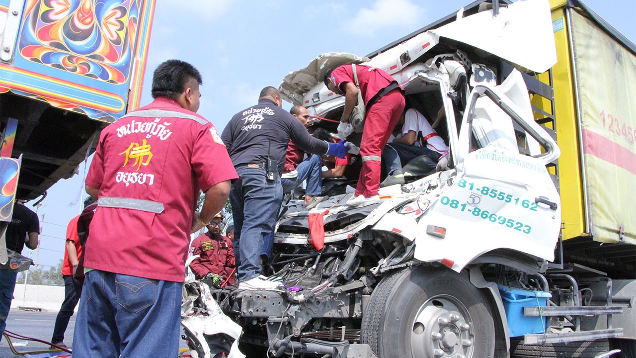 เกิดเหตุรถบรรทุกทราย 18 ล้อ เบรกกะทันหัน ส่งผลให้รถบรรทุกสินค้า 18 ล้อ พุ่งชนท้ายอย่างจัง คนขับติดภายในเจ็บสาหัส บนถนนสายเอเชีย ขาล่องเข้ากรุงเทพมหานคร กม.ที่ 45 อ.บางปะอิน