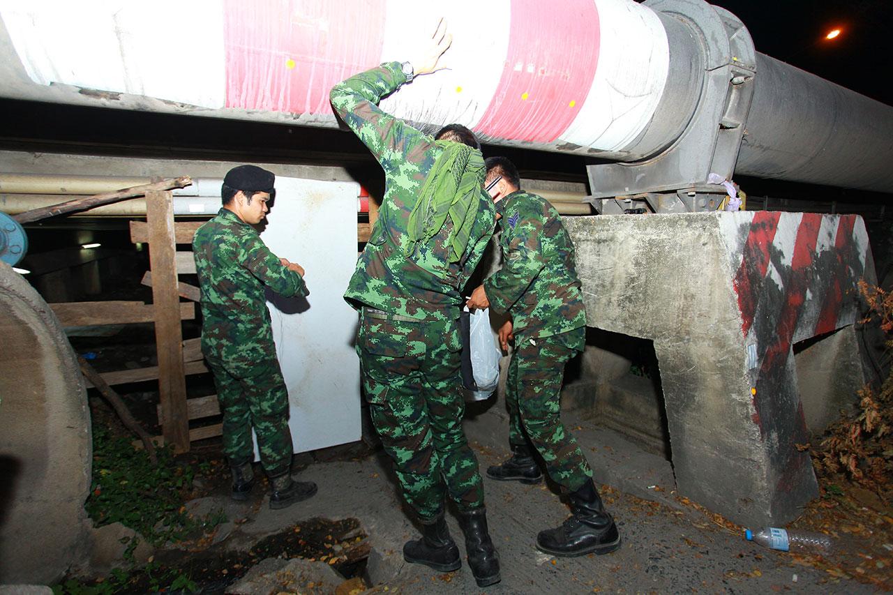 ทางเจ้าหน้าที่ชี้แจงสาเหตุที่นำแผงเหล็กมากั้นตลอดแนวว่า เพื่อความเป็นระเบียบกับกลุ่มลูกศิษย์ที่มานั่งสวดมนต์เท่านั้น ก่อนที่พระและกลุ่มลูกศิษย์จะทยอยกันเข้าไป นอกจากนี้ทางทหารยังนำไม้มาทำเป็นแผงปิดตายทางเดินลอดใต้สะพานข้ามคลองแอน หลังจากมีพระและกลุ่มลูกศิษย์ใช้เป็นเส้นทางเดินพยายามข้ามไปฝั่งทางเข้าวัดด้านประตู 5-6 แล้วหลายครั้ง