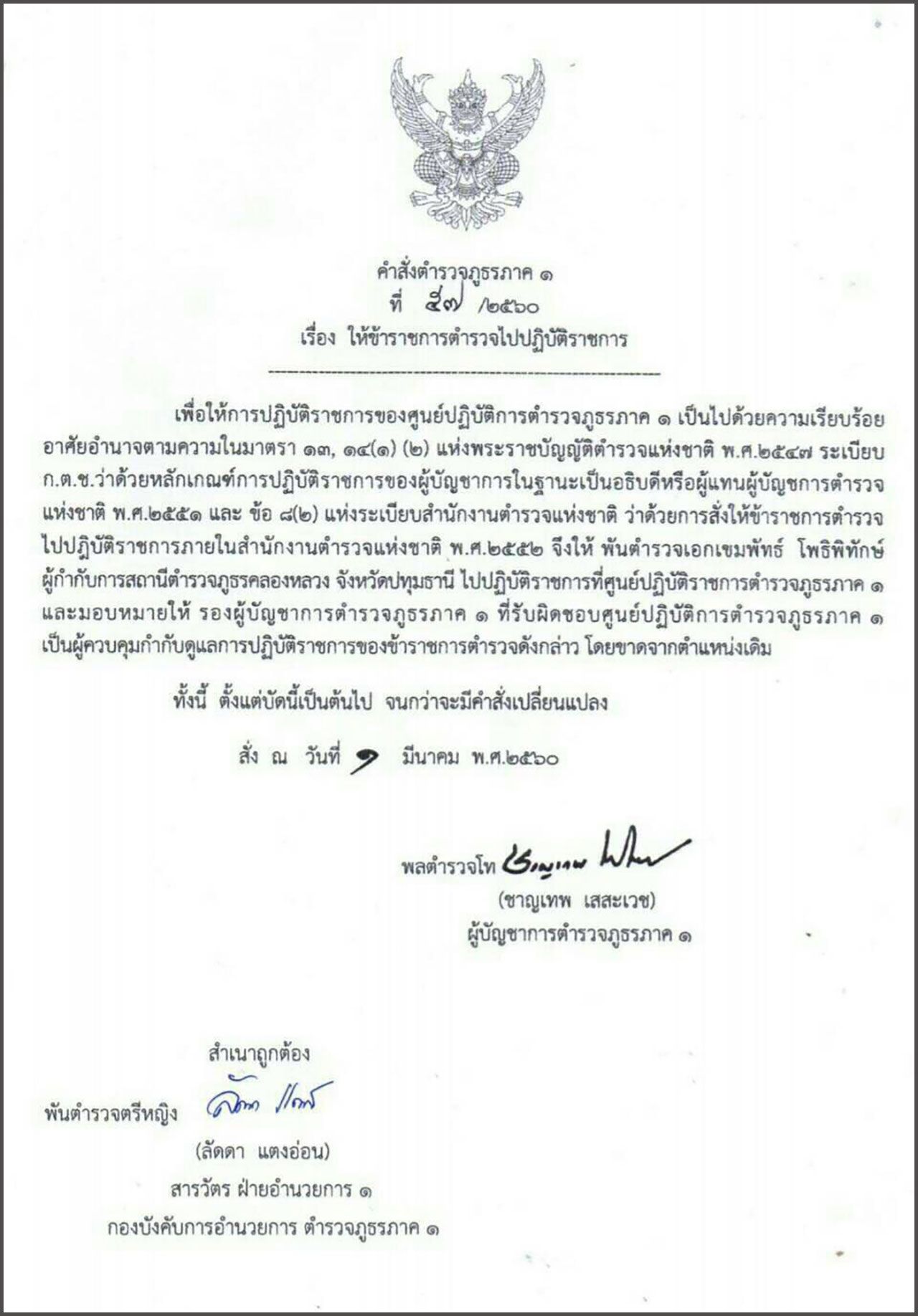 วันที่ 1 มี.ค. ผู้สื่อข่าวรายงานว่า ได้มีคำสั่ง ตำรวจภูธรภาค 1 ที่ 56/2560 ลงนาม โดย พล.ต.ท.ชาญเทพ เสสะเวช ผบช.ภ.1 ให้ พ.ต.อ.เขมพัทธ์ โพธิพิทักษ์ ผู้กำกับการ สภ.คลองหลวง จ.ปทุมธานี ไปปฏิบัติหน้าที่ที่ศูนย์ปฏิบัติราชการตำรวจภูธรภาค 1 และมอบหมายให้ รองผู้บัญชาการตำรวจภูธรภาค 1 ที่รับผิดชอบศูนย์ดังกล่าว เป็นผู้ควบคุมดูแลการปฏิบัติราชการของข้าราชการตำรวจดังกล่าว โดยให้ขาดจากตำแหน่งเดิม จนกว่าจะมีคำสั่งเปลี่ยนแปลง