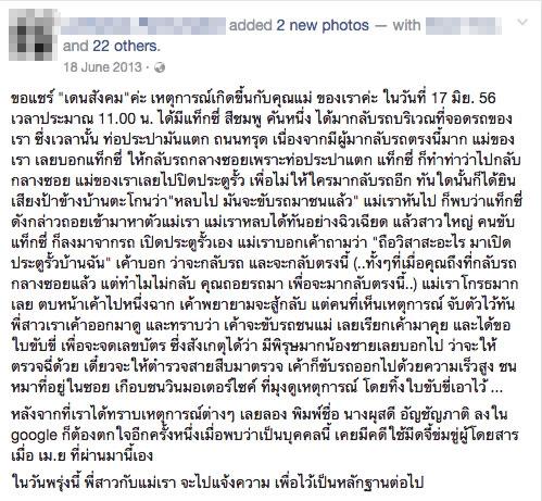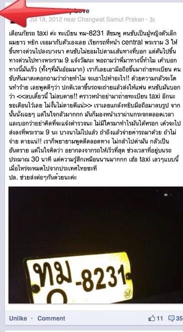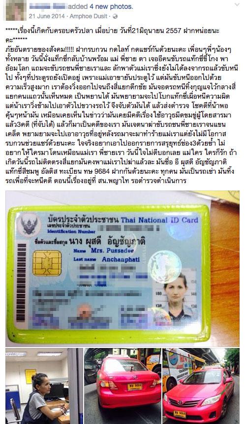22 กันยายน 2556 ผู้โดยสารสาวโดยสารแท็กซี่ทะเบียน ทม 8231 โดยมีนางผุสดี เป็นผู้ขับขี่ และพบว่ามีพฤติกรรมขับอ้อม จึงพูดเปรยๆ ทำให้คนขับเกิดความไม่พอใจ หญิงสาวที่นั่งมาจึงขอลง จากนั้นคนขับได้เปิดประตูข่มขู่ให้จ่ายตัง และยังขู่ว่าจะมาดักเจอที่ทำงาน จึงนำเรื่องราวมาโพสต์เตือนภัย