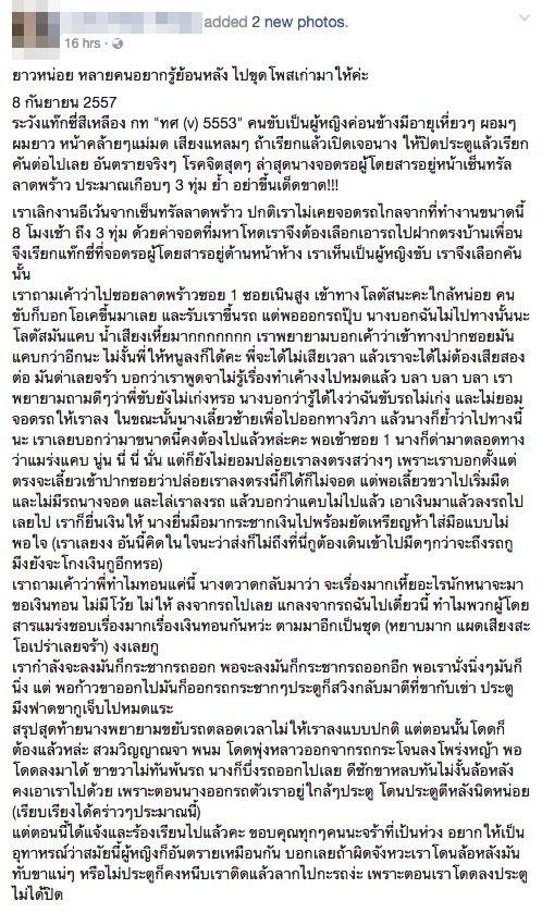 8 กันยายน 2557 ผู้โดยสารสาวโบกเรียกแท็กซี่สีเหลือง ทษ 5553 โดยมีนางผุสดี เป็นขับขี่ และมีพฤติกรรมขับอ้อม หญิงสาวจึงได้ทักท้วง ส่งผลให้คนขับไม่พอใจไล่ลงก่อนถึงจุดหมาย ซ้ำยังโกงเงินทอน และขับกระชากออกขณะลงจากรถ จนได้รับบาดเจ็บ