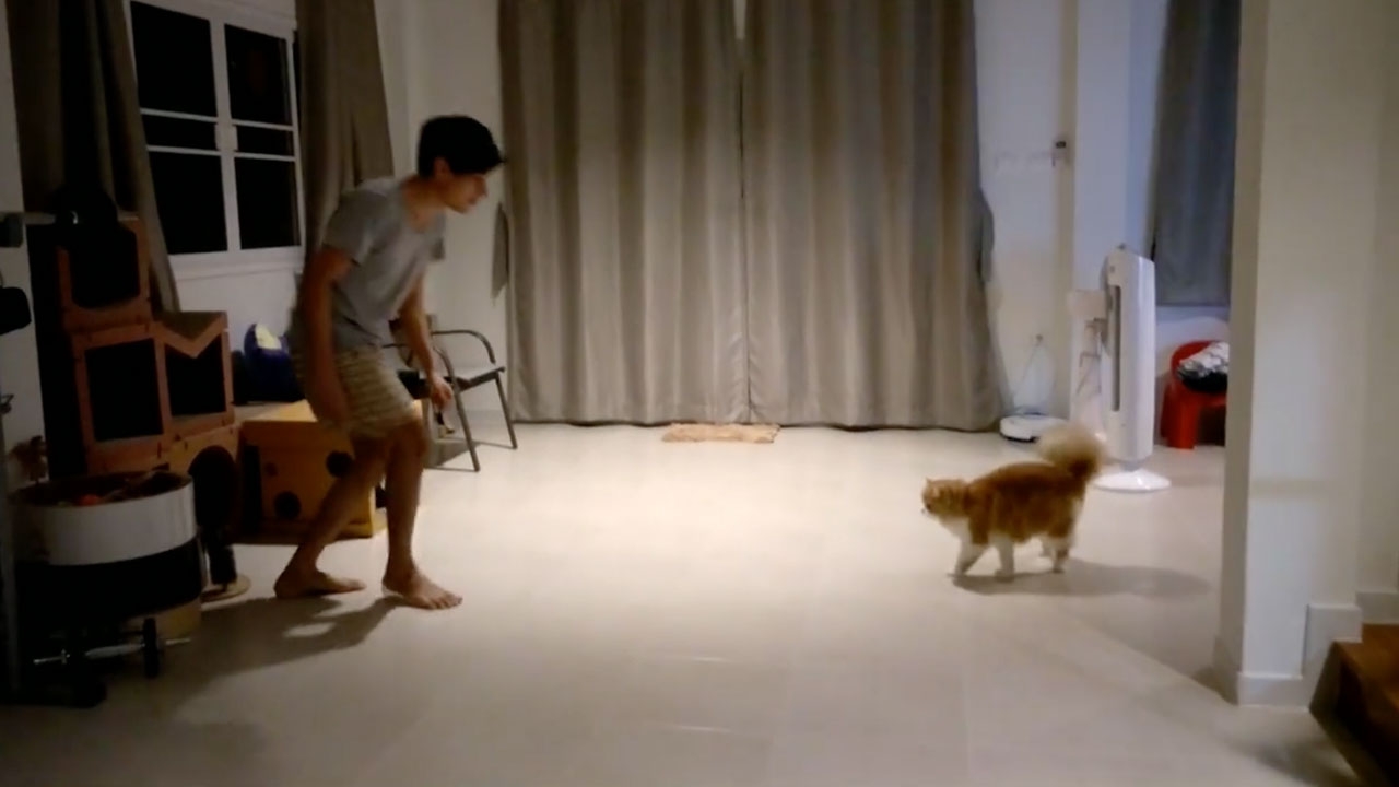 ในคลิปเป็นภาพ เจ้านายและเจ้ากังฟู กำลังโชว์ลีลาการปล่อยพลังตีลังกาโต้ตอบกันอยู่ โดยที่ทาสแมวทำท่าทางเตะเจ้าเหมียว ส่วนเจ้ากังฟูก็พองขนตีลังกาโต้กลับทันที เรียกได้ว่า รับส่งมุขกันได้พร้อมดีเป๊ะยิ่งกว่านักแสดงชั้นนำเสียอีก