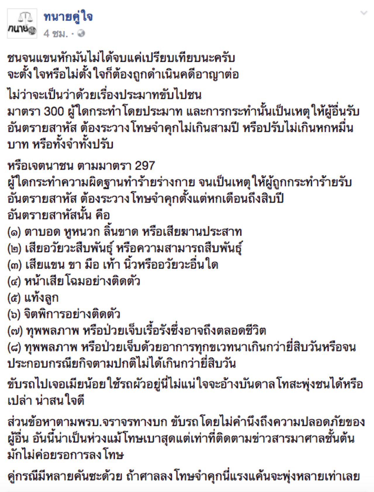 ขณะที่ทนายชื่อดัง นายรณณรงค์ แก้วเพ็ชร์ ได้โพสต์แสดงความคิดเห็นผ่านแฟนเพจทนายคู่ใจ ถึงกรณีนี้ว่า อาจเข้าข่ายมีความผิดอาญา พร้อมกับอ้างอิงข้อกฎหมายที่เกี่ยวข้อง โดยข้อความส่วนหนึ่งระบุว่า "ชนจนแขนหักมันไม่ได้จบแค่เปรียบเทียบนะครับ จะตั้งใจหรือไม่ตั้งใจก็ต้องถูกดำเนินคดีอาญาต่อ ไม่ว่าจะเป็นว่าด้วยเรื่องประมาทขับไปชน มาตรา 300 ผู้ใดกระทำโดยประมาท และการกระทำนั้นเป็นเหตุให้ผู้อื่นรับอันตรายสาหัส ต้องระวางโทษจำคุกไม่เกินสามปี หรือปรับไม่เกินหกหมื่นบาท หรือทั้งจำทั้งปรับ หรือเจตนาชน ตามมาตรา 297 ผู้ใดกระทำความผิดฐานทำร้ายร่างกาย จนเป็นเหตุให้ผู้ถูกกระทำร้ายรับอันตรายสาหัส ต้องระวางโทษจำคุกตั้งแต่หกเดือนถึงสิบปี”