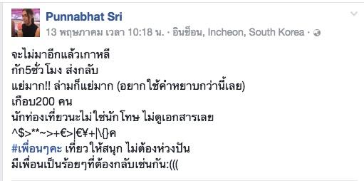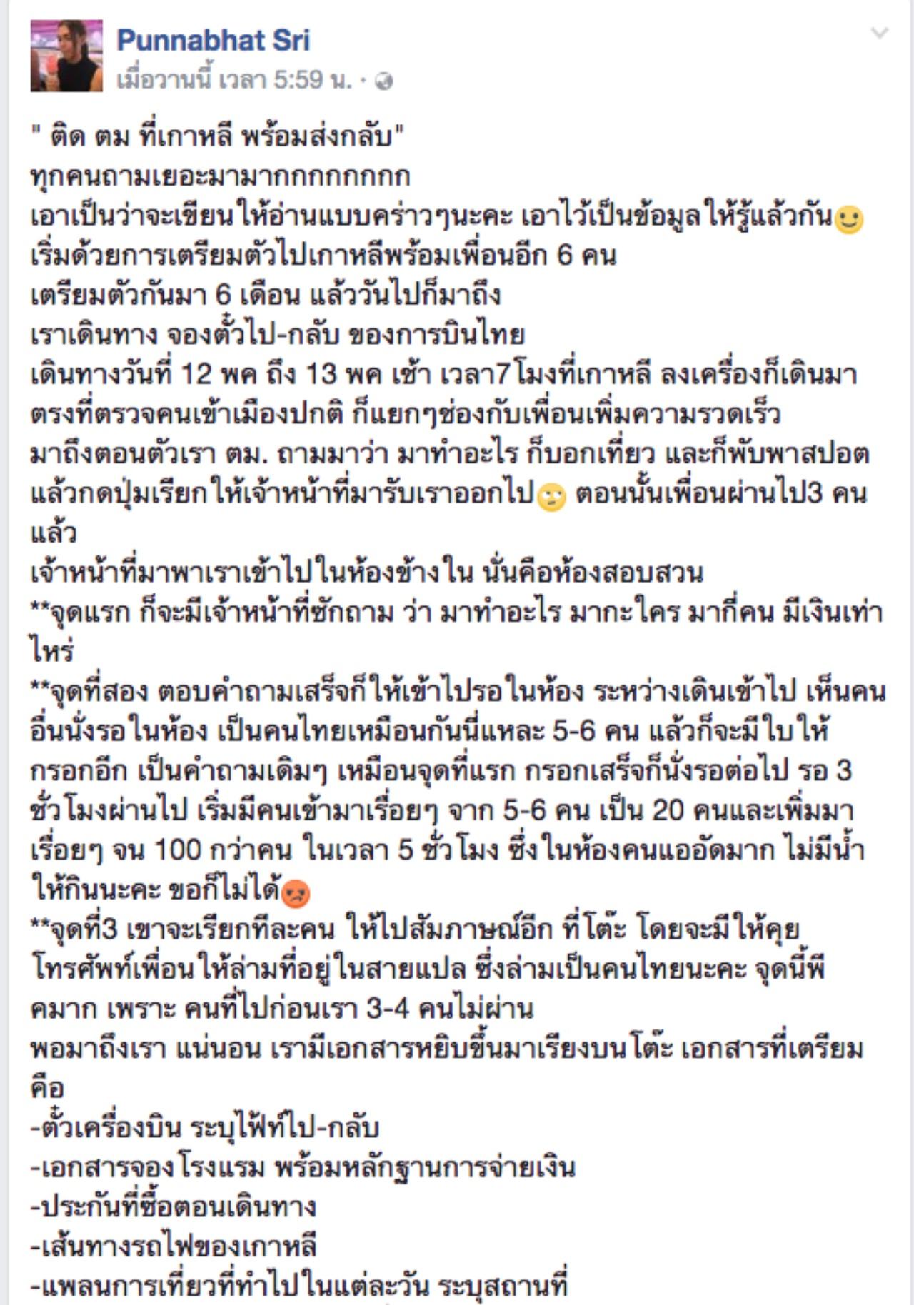 อย่างที่เธอโพสต์ไว้ Punnabhat Sri เล่าว่า เขาถามคำถามเดิมที่เคยถาม จากนั้นก็ถามว่า จะไปไหนบ้าง ลองบอกมา เมื่อเราก้มดูแพลนที่เตรียมไว้ (แผนเดินทาง 8 วัน) แต่แล้วจู่ๆ เจ้าหน้าที่ ซึ่งเป็นคนเกาหลีก็มากระชากแพลนเที่ยวเราไปจากมือ ตอนนั้นโกรธมาก เราก็บอกล่ามว่า เฮ้ย ทำไมเอาแพลนที่เราทำมาไปล่ะ เราก็ไม่ได้ถนัดนะว่า ที่ไหนอยู่ตรงไหน ล่ามก็ (ตะคอก) คุณต้องรู้สิคะ ถ้าไม่รู้คุณจะมาทำไม เราก็อ่ะ ขอโทษนะคะ แพลนนี้เพื่อนเราทำมาให้ เรามากับเพื่อนซึ่งเพื่อนจะพาเที่ยว ตม.ถาม แล้วเพื่อนคุณอยู่ไหน? เราตอบว่าเพื่อนผ่านหมดแล้ว 6 คน รอด้านนอกเอากระเป๋า ตม.ตอบ ไม่มี เรายืนยัน มี!! พยายามบอกล่าม ล่ามตัดบทไม่มีค่ะ เพื่อนไม่รอคุณ คุณมาคนเดียว? เรา พยายามหาเปิดรูปให้ดู แต่เขาก็ไม่สนใจ