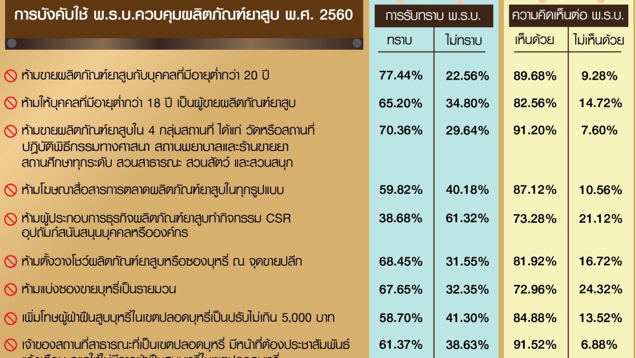 เมื่อถามถึงการรับทราบเกี่ยวกับการบังคับใช้ พ.ร.บ.ควบคุมผลิตภัณฑ์ยาสูบ พ.ศ. 2560 ในประเด็นต่างๆ พบว่า การห้ามขายผลิตภัณฑ์ยาสูบกับบุคคลที่มีอายุต่ำกว่า 20 ปี พบว่า ประชาชนส่วนใหญ่ ร้อยละ 77.44 ระบุว่า ทราบ และร้อยละ 22.56 ระบุว่า ไม่ทราบ การห้ามให้บุคคลที่มีอายุต่ำกว่า 18 ปี เป็นผู้ขายผลิตภัณฑ์ยาสูบ พบว่า ประชาชนส่วนใหญ่ ร้อยละ 65.20 ระบุว่า ทราบ และร้อยละ 34.80 ระบุว่า ไม่ทราบ การห้ามขายผลิตภัณฑ์ยาสูบใน 4 กลุ่มสถานที่ ได้แก่ วัดหรือสถานที่ปฏิบัติพิธีกรรมทางศาสนา สถานพยาบาลและร้านขายยา สถานศึกษาทุกระดับ สวนสาธารณะ สวนสัตว์ และสวนสนุก พบว่า ประชาชนส่วนใหญ่ ร้อยละ 70.36 ระบุว่า ทราบ และร้อยละ 29.64 ระบุว่า ไม่ทราบ