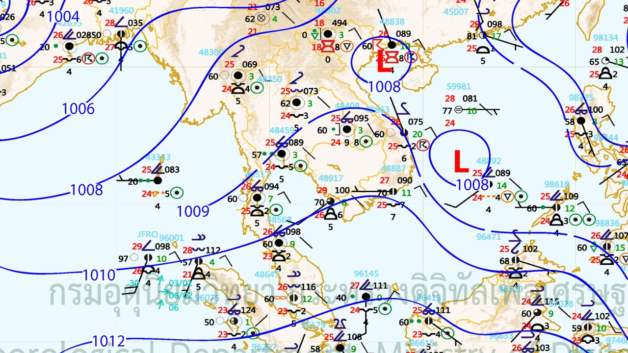 พยากรณ์อากาศสำหรับประเทศไทยตั้งแต่เวลา 06:00 วันนี้ ถึง 06:00 วันพรุ่งนี้.