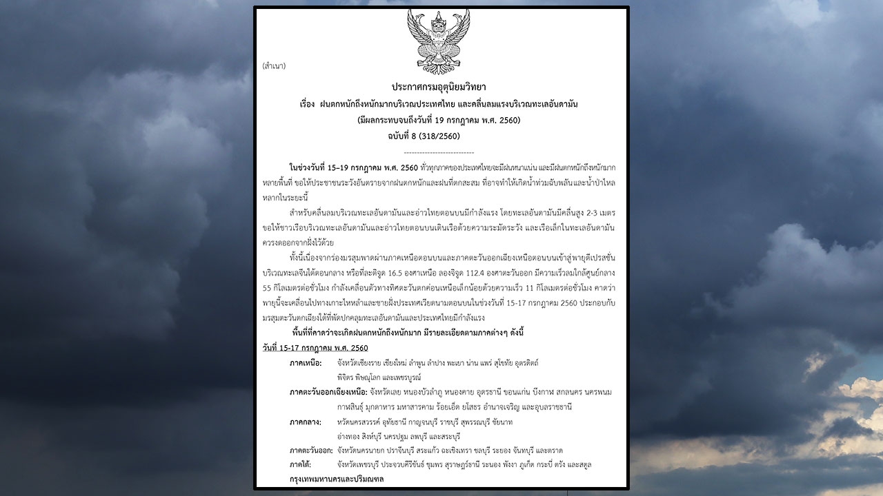 "ฝนตกหนักถึงหนักมากบริเวณประเทศไทย และคลื่นลมแรงบริเวณทะเลอันดามัน (มีผลกระทบจนถึงวันที่ 19 กรกฎาคม พ.ศ. 2560)" ฉบับที่ 8 ลงวันที่ 15 กรกฎาคม 2560