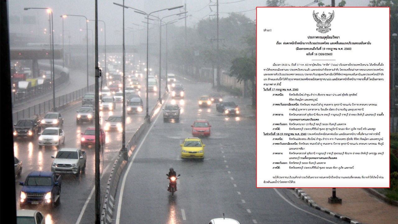 กรมอุตุนิยมวิทยา ออกประกาศเตือนภัยลักษณะอากาศ ฝนตกหนักถึงหนักมากบริเวณประเทศไทย และคลื่นลมแรงบริเวณทะเลอันดามัน (มีผลกระทบจนถึงวันที่ 19 กรกฎาคม พ.ศ. 2560) ฉบับที่ 16 ลงวันที่ 17 กรกฎาคม 2560