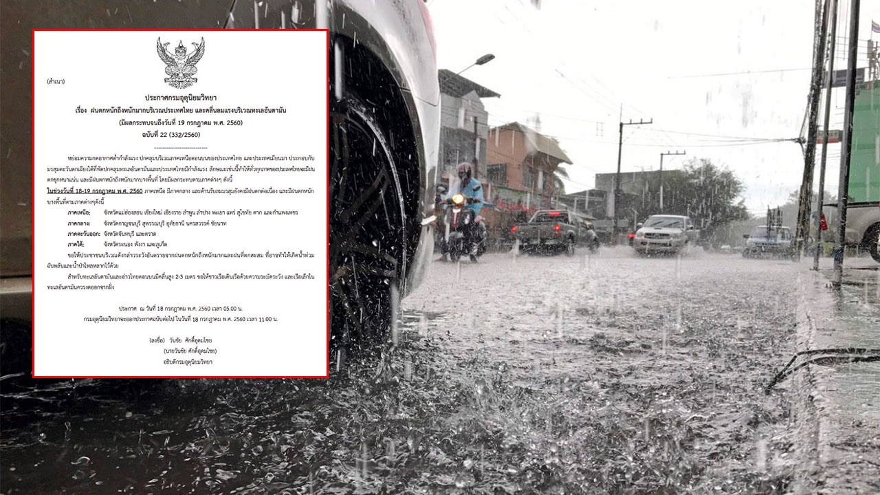 ประกาศกรมอุตุนิยมวิทยา"ฝนตกหนักถึงหนักมากบริเวณประเทศไทย และคลื่นลมแรงบริเวณทะเลอันดามัน ฉบับที่ 22 ภาคเหนือ มีภาคกลาง และด้านรับลมมรสุมยังคงมีฝนตกต่อเนื่อง ส่วน ทะเลอันดามันและอ่าวไทยตอนบนมีคลื่นสูง 2-3 เมตร...
