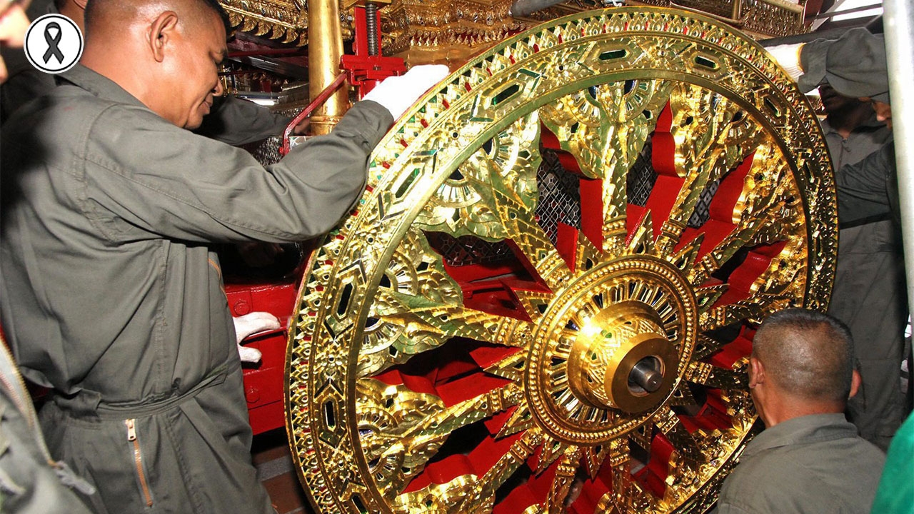 กำลังพลของกรมสรรพาวุธทหารบกช่วยกันติดตั้งล้อประดับพระมหาพิชัยราชรถหมายเลข 9780 เสร็จสมบูรณ์ในส่วนประกอบโครงสร้างหลักแล้ว เหลือเพียงงานประณีตศิลป์และการตกแต่งให้วิจิตรงดงามเพื่อให้พร้อมใช้ในการอัญเชิญพระบรมโกศ ส่วนราวบันไดนาคดำเนินการจัดสร้างครบ 4 ชั้นแล้ว เตรียมทดลองนำไปติดตั้งยังพระเมรุมาศ