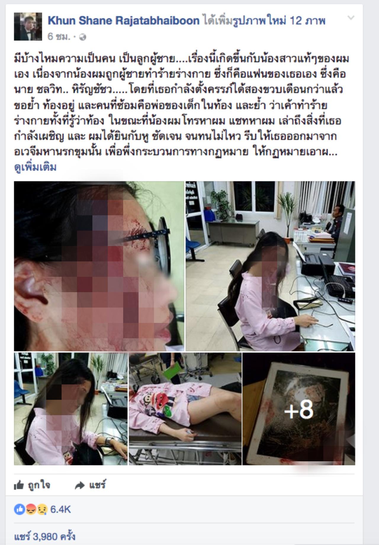 ผู้สื่อข่าวรายงานว่า จากกรณี Khun Shane Rajatabhaiboon ได้โพสต์ภาพหญิงสาวคนหนึ่งในสภาพเลือดอาบ รุดแจ้งความที่ สน.แห่งหนึ่ง พร้อมบรรยายว่า ประมาณว่า น้องสาวถูกผู้ชายคนหนึ่งทำร้ายร่างกาย ทั้งที่เธอยังได้ตั้งท้องอยู่ 2 เดือน ซึ่งเธอได้รับบาดเจ็บมีแผลที่ขมับขวา นอกจากนี้ยังมีการกล่าวถึงเรื่องหยิบยืมเงินด้วย ซึ่ง ล่าสุด เขาได้ไปลงบันทึกประจำวันเป็นที่เรียบร้อยแล้ว