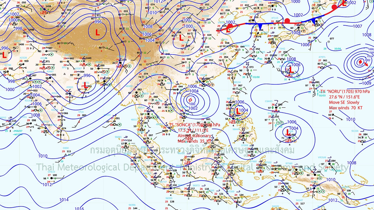 ลักษณะสำคัญทางอุตุนิยมวิทยา เมื่อเวลา 04.00 น. ของวันนี้ (24 ก.ค. 60) พายุโซนร้อน “เซินกา” (SONCA) บริเวณทะเลจีนใต้ตอนบน มีศูนย์กลางอยู่ห่างประมาณ 500 กิโลเมตรทางทิศตะวันออกของเมืองฮานอย ประเทศเวียดนาม หรือที่ละติจูด 17.2 องศาเหนือ ลองจิจูด 111.3 องศาตะวันออก มีความเร็วลมสูงสุดใกล้ศูนย์กลาง ประมาณ 35 นอต หรือ 65 กม./ชม. พายุนี้กำลังเคลื่อนตัวอย่างช้าๆ คาดว่าจะเคลื่อนขึ้นฝั่งบริเวณประเทศเวียดนามตอนบนในวันที่ 25 กรกฎาคม 2560 และจะเคลื่อนผ่านภาคตะวันออกเฉียงเหนือ และภาคเหนือในระยะต่อไป ลักษณะเช่นนี้ทำให้ประเทศไทยตอนบนมีฝนตกชุกหนาแน่นกับมีฝนตกหนักถึงหนักมากหลายพื้นที่ในภาคเหนือ ภาคตะวันออกเฉียงเหนือ และภาคตะวันออก ขอให้ประชาชนติดตามข่าวพยากรณ์อากาศอย่างใกล้ชิดไว้ด้วย สำหรับมรสุมตะวันตกเฉียงใต้ที่พัดปกคลุมทะเลอันดามันและประเทศไทยมีกำลังแรง ลักษณะเช่นนี้ทำให้ประเทศไทยมีฝนตกชุกหนาแน่น และมีฝนตกหนักบางแห่ง สำหรับคลื่นลมบริเวณทะเลอันดามันและอ่าวไทยตอนบนมีกำลังปานแรง