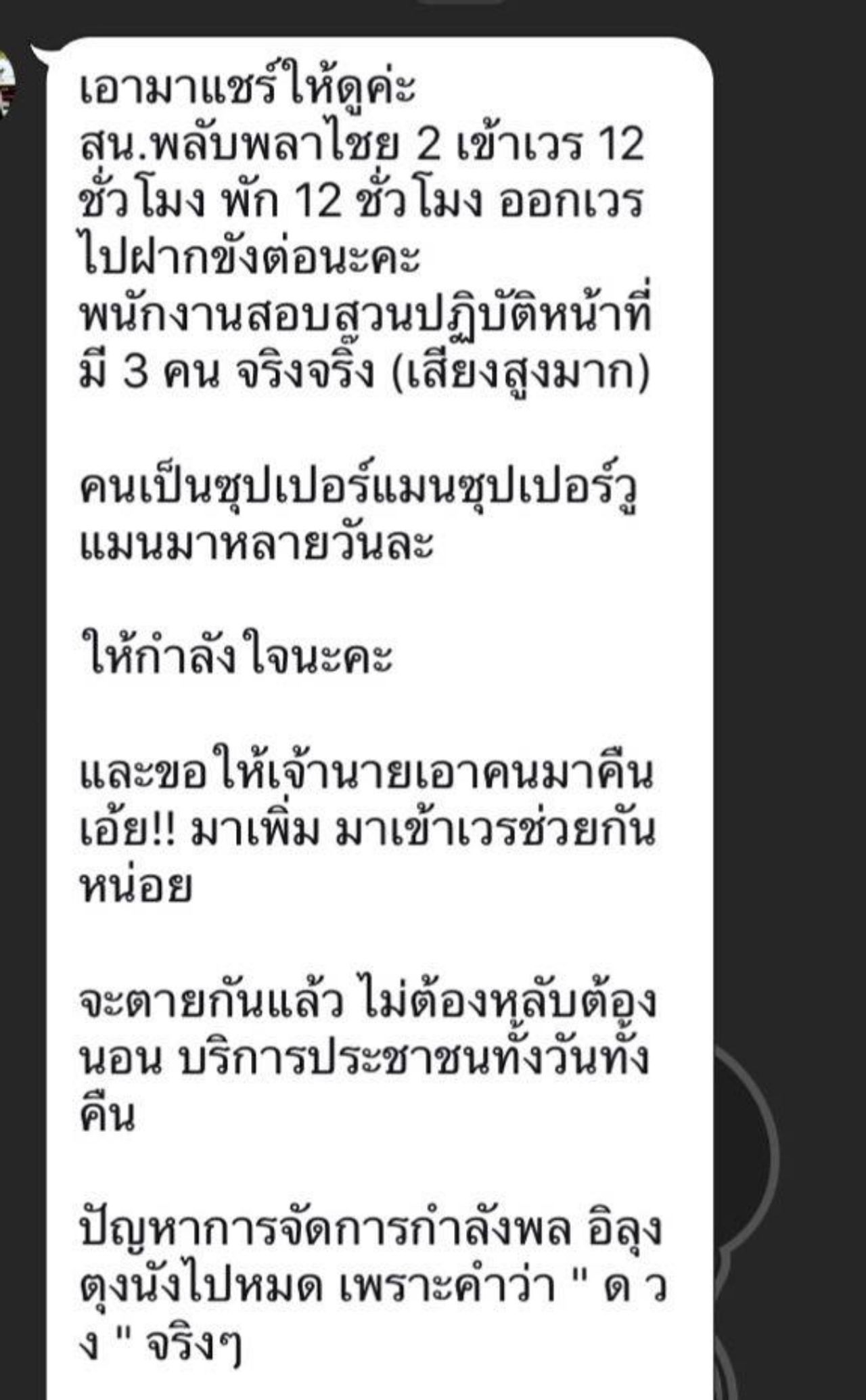 เอามาแชร์ให้ดูค่ะ สน.พลับพลาไชย 2 เข้าเวร 12 ชั่วโมง พัก 12 ชั่วโมง ออกเวรไปฝากขังต่อนะคะ พนักงานสอบสวนปฏิบัติหน้าที่มี 3 คน จริงจริ๊ง (เสียงสูงมาก) คนเป็นซุปเปอร์แมนซุปเปอร์วูแมนมาหลายวันละ ให้กำลังใจนะคะ และขอให้เจ้านายเอาคนมาคืน เอ้ย!! มาเพิ่ม มาเข้าเวรช่วยกันหน่อย จะตายกันแล้ว ไม่ต้องหลับต้องนอน บริการประชาชนทั้งวันทั้งคืน ปัญหาการจัดการกำลังพล อิลุงตุงนังไปหมด เพราะคำว่า " ด ว ง " จริงๆ แก้ไขปัญหา ปฏิรูปตำรวจ เอาจัดการกำลังพลให้ได้ เอาคนมาไม่ใช่ให้วิ่งไปช่วยราชการ เอาคนที่อยู่มีกำลังใจทำงานด้วยขวัญและกำลังใจ ตำรวจไทย กระเจิดกระเจิงหมดละ ปล.อัตราเต็ม 17 คน อัตราจริง 14 คน อัตราเข้าเวร 3 คน #ปฏิรูปตำรวจ #ปฏิรูปงานกำลังพล #สอบสวน #ขวัญกำลังใจ