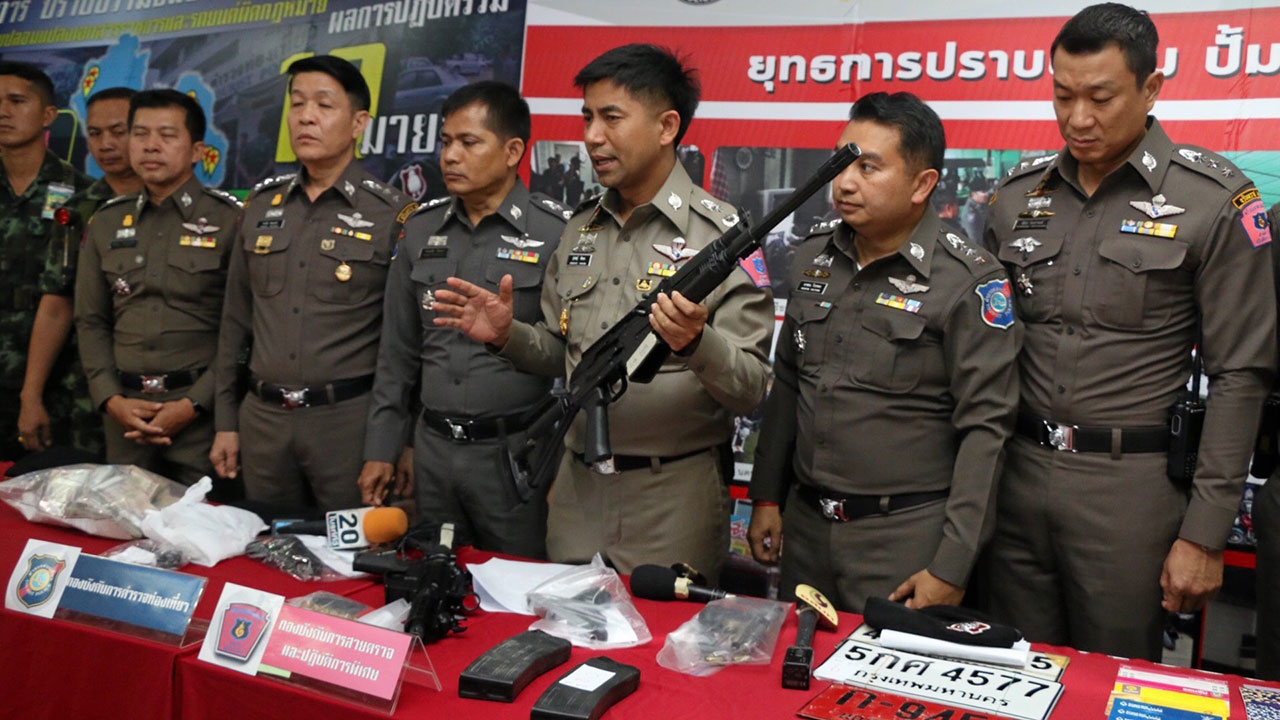 พล.ต.ต.สุรเชษฐ์ หักพาล ผบก.สปพ. แถลงผลยุทธการปราบปรามปั๊มป้ายปลอมครั้งที่ 4 ตรวจค้น 21 จุด ทั่วประเทศ ยึดรถยนต์และรถจักรยานยนต์ 300 คัน อาวุธปืน 5 กระบอก เงินสด 2 ล้านบาท.