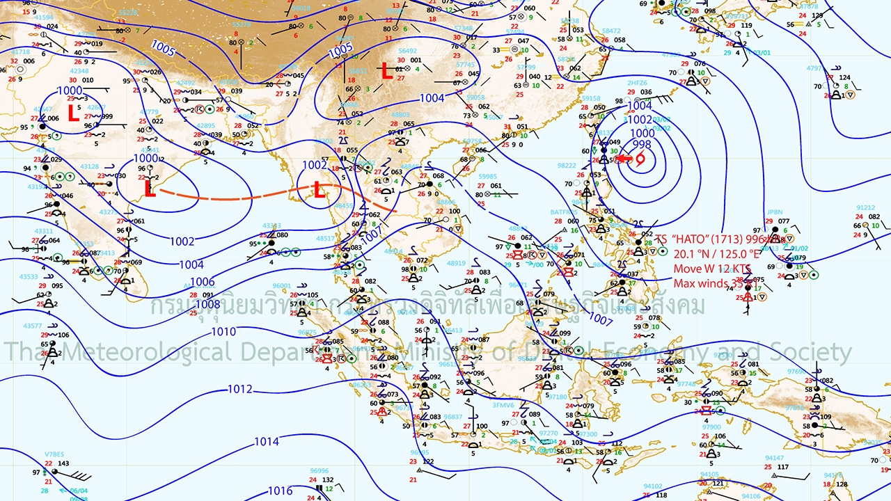 ลักษณะสำคัญทางอุตุนิยมวิทยา ร่องมรสุมพาดผ่านภาคเหนือตอนล่าง ภาคกลาง และภาคตะวันออกเฉียงเหนือ สำหรับมรสุมตะวันตกเฉียงใต้ที่พัดปกคลุมทะเลอันดามันและภาคใต้ มีกำลังอ่อนลง ลักษณะเช่นนี้ทำให้ประเทศไทยตอนบนยังคงมีฝนตกชุกหนาแน่น กับมีฝนตกหนักบางพื้นที่ สำหรับคลื่นลมบริเวณทะเลอันดามันมีกำลังอ่อนลง อนึ่ง เมื่อเวลา 04.00 น. ของวันนี้ ( 21 ส.ค. 60) พายุโซนร้อน “ฮาโตะ” (Hato) บริเวณด้านตะวันออกของเกาะลูซอน ประเทศฟิลิปปินส์ คาดว่า จะเคลื่อนผ่านตอนบนของเกาะลูซอน ประเทศฟิลิปปินส์ ในวันที่ 22 ส.ค.60 และจะเคลื่อนลงสู่ทะเลจีนใต้ตอนบนในระยะต่อไป โดยพายุนี้ยังไม่มีผลกระทบต่อประเทศไทยในช่วงวันดังกล่าว สำหรับผู้ที่จะเดินทางไปเกาะลูซอน ประเทศฟิลิปปินส์ ควรตรวจสอบสภาพอากาศก่อนเดินทาง และขอให้ประชาชนติดตามข่าวพยากรณ์อากาศอย่างใกล้ชิด