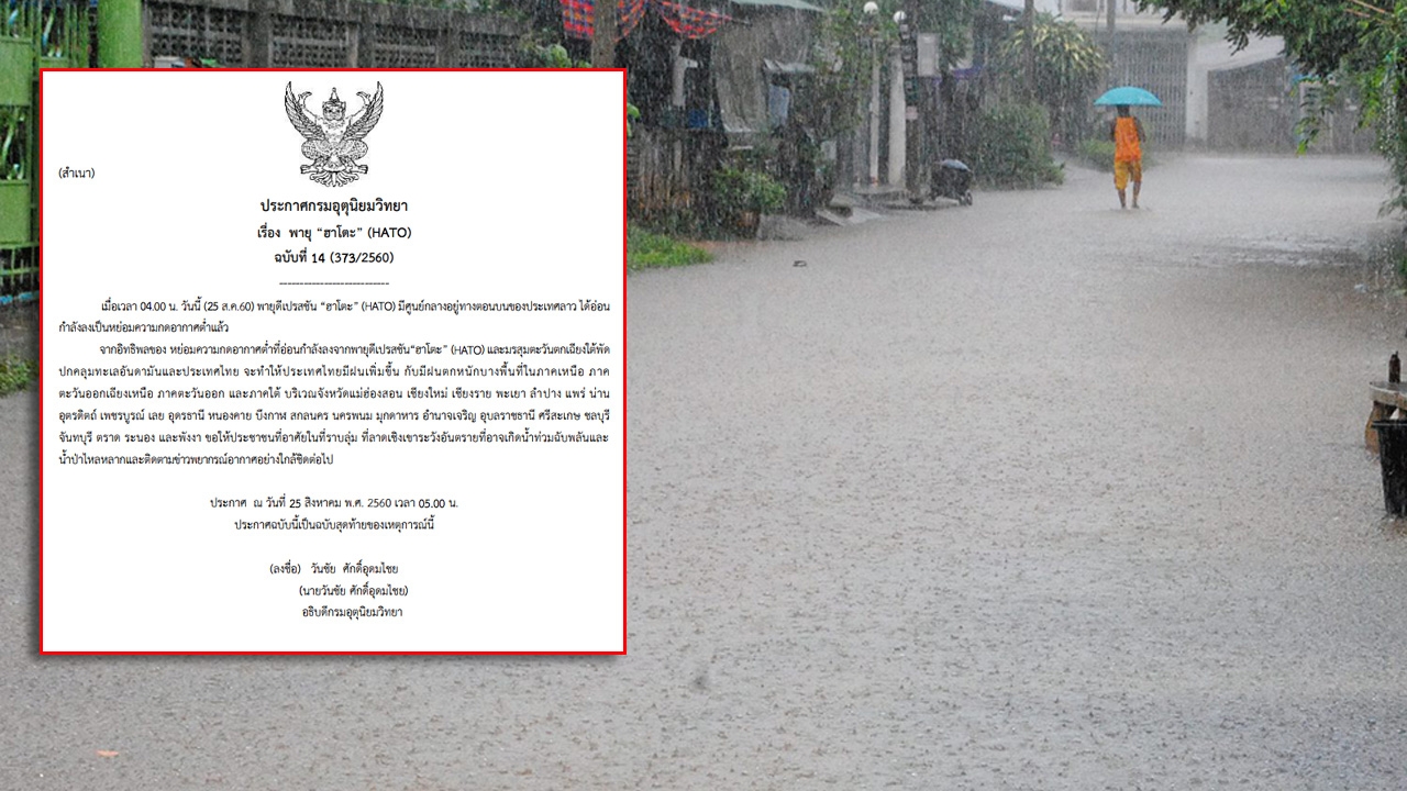 ประกาศ ฉบับที่ 14 กรมอุตุนิยมวิทยา พายุดีเปรสชัน“ฮาโตะ” (HATO) อ่อนกำลังเป็นหย่อมความกดอากาศต่ำแล้ว แต่ยังทำทั่วไทยมีฝนเพิ่ม เตือนปชช.ในที่ราบลุ่ม ที่ลาดเชิงเขา ระวังอันตรายที่อาจเกิดน้ำท่วมฉับพลัน และน้ำป่าไหลหลาก