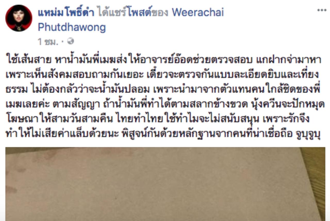 ขณะที่แฟนเพจ แหม่มโพธิ์ดำ ระบุว่า ใช้เส้นสาย หาน้ำมันพี่ ม.ส่งให้อาจารย์อ๊อดช่วยตรวจสอบ แกฝากจ่ามาหา เพราะเห็นสังคมสอบถามกันเยอะ เดี๋ยวจะตรวจกันแบบละเอียดยิบและเที่ยงธรรม ไม่ต้องกลัวว่าจะน้ำมันปลอม เพราะนำมาจากตัวแทนคนใกล้ชิดของพี่ม.เลยค่ะ ตามสัญญา ถ้าน้ำมันพี่ทำได้ตามฉลากข้างขวด นุ้งควีนจะปักหมุดโฆษณาให้สามวันสามคืน ไทยทำไทยใช้ทำไมจะไม่สนับสนุน เพราะรักจึงทำให้ไม่เสียค่าแล็บด้วยนะ พิสูจน์กันด้วยหลักฐานจากคนที่น่าเชื่อถือ
