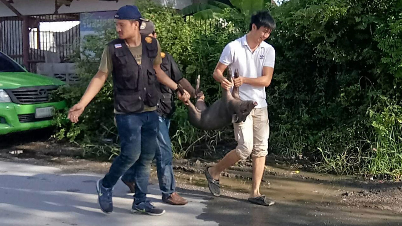 เจ้าหน้าที่ช่วยกันจับหมูป่าที่บริเวณใต้ทางด่วนแจ้งวัฒนะ ถนน แจ้งวัฒนะ ต.บางตลาด อ.ปากเกร็ด จ.นนทบุรี คนงานก่อสร้างเลี้ยงไว้ ภายหลังเสร็จงานไม่เอาไปด้วย จนหมูป่าขยายพันธุ์อย่างรวดเร็วมากกว่า 70 ตัว เดินป่วนขึ้นไปบนทางด่วน.