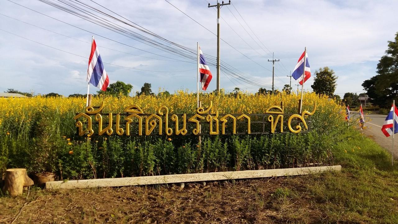 นายสำราญ หนุนนาค นายกเทศบาลตำบลในเมือง อ.สวรรคโลก จ.สุโขทัย ร่วมกับจนท.ได้ปรับปรุงพื้นที่จำนวน 10 ไร่ ช่วยกันปลูกไว้เมื่อปลายเดือนสิงหาคมที่ผ่านมา เพื่อถวายเป็นพระราชกุศลในงานพระราชพิธีถวายพระเพลิงพระบรมศพ ในหลวง รัชกาลที่ 9 และน้อมสำนึกในพระมหากรุณาธิคุณอันหาที่สุดมิได้ โดยใช้เวลาปลูกประมาณ 50 วัน จึงออกดอกเหลืองอร่าม สร้างความสวยงามให้กับหมู่บ้าน และเส้นทางสายดังกล่าวได้เป็นอย่างมาก จนกลายเป็นแลนด์มาร์กแห่งใหม่ใน อ.สวรรคโลก ซึ่งถนนเส้นนี้ถือว่าเป็นถนนเส้นหลักที่ใช้สัญจรไปมาระหว่าง จ.สุโขทัย เดินทางไปจังหวัดอุตรดิตถ์
