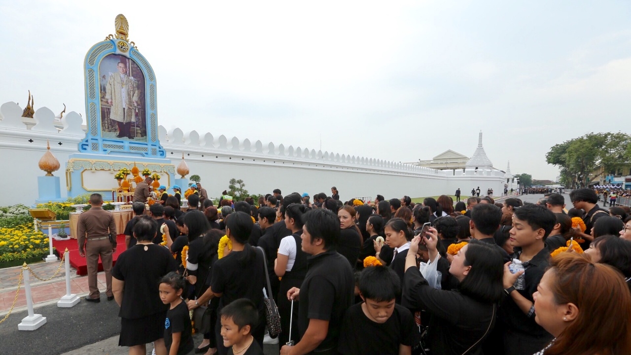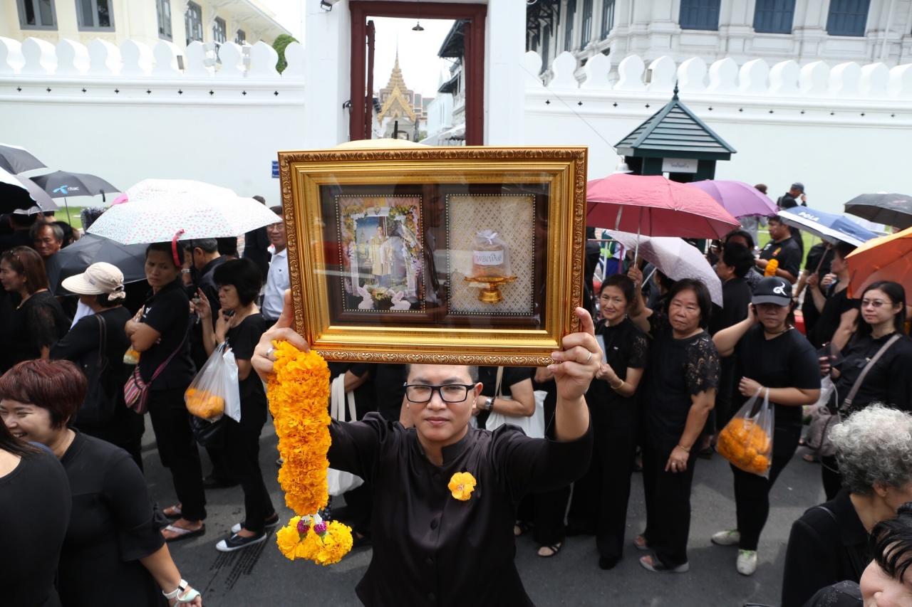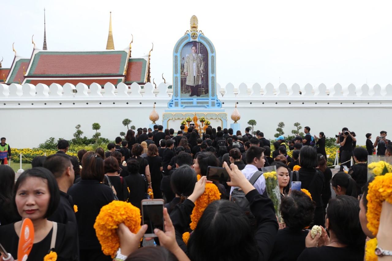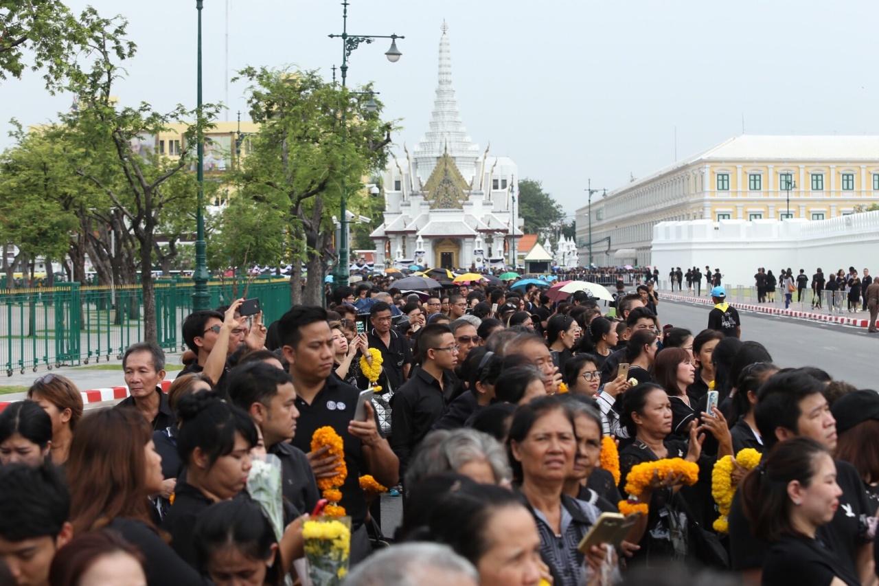 เมื่อวันที่ 13 ต.ค.2560 ประชาชนจากทั่วสารทิศ ทยอยเดินทางมายังสนามหลวง เพื่อต่อแถวเข้าถวายพวงมาลัย-ดอกไม้สดเบื้องหน้าพระบรมฉายาลักษณ์พระบาทสมเด็จพระปรมินทรมหาภูมิพลอดุลยเดช ที่หน้าพระบรมมหาราชวัง อย่างต่อเนื่องไม่มีขาดสาย ท่ามกลางสายฝนที่โปรยปราย โดยมีการอำนวยความสะดวกของจิตอาสา และเจ้าหน้าที่สำนักพระราชวังช่วยเหลืออย่างใกล้ชิด