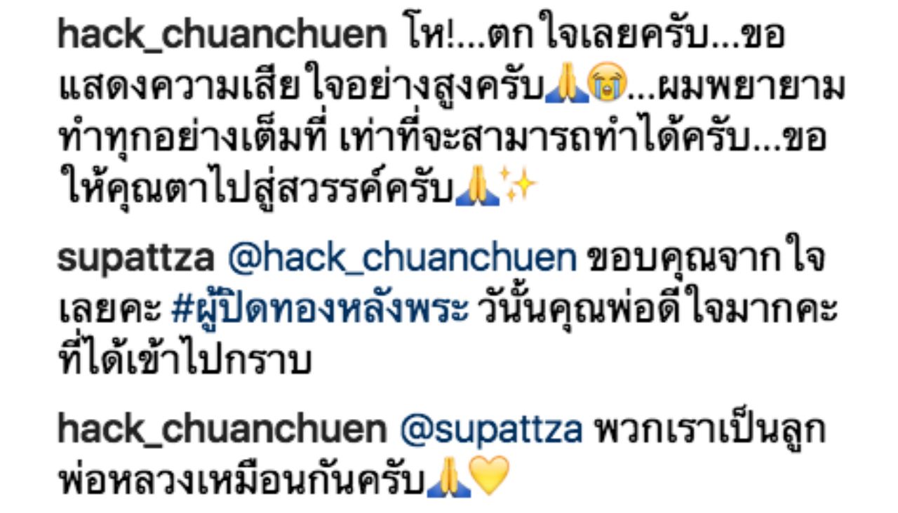 ทั้งนี้เมื่อ แฮ็ค เห็นข้อความดังกล่าวได้มาคอมเมนต์ตอบกลับว่า "โห!...ตกใจเลยครับ...ขอแสดงความเสียใจอย่างสูง ครับ...ผมพยายามทำทุกอย่างเต็มที่ เท่าที่จะสามารถทำได้ครับ...ขอให้คุณตาไปสู่สวรรค์ครับ พวกเราเป็นลูกพ่อหลวงเหมือนกันครับ"