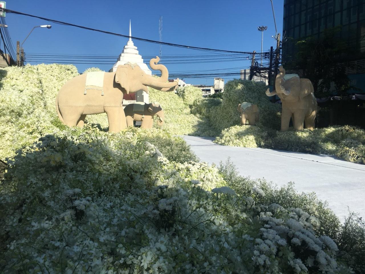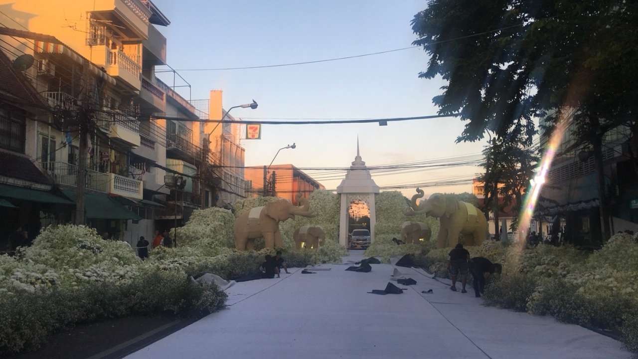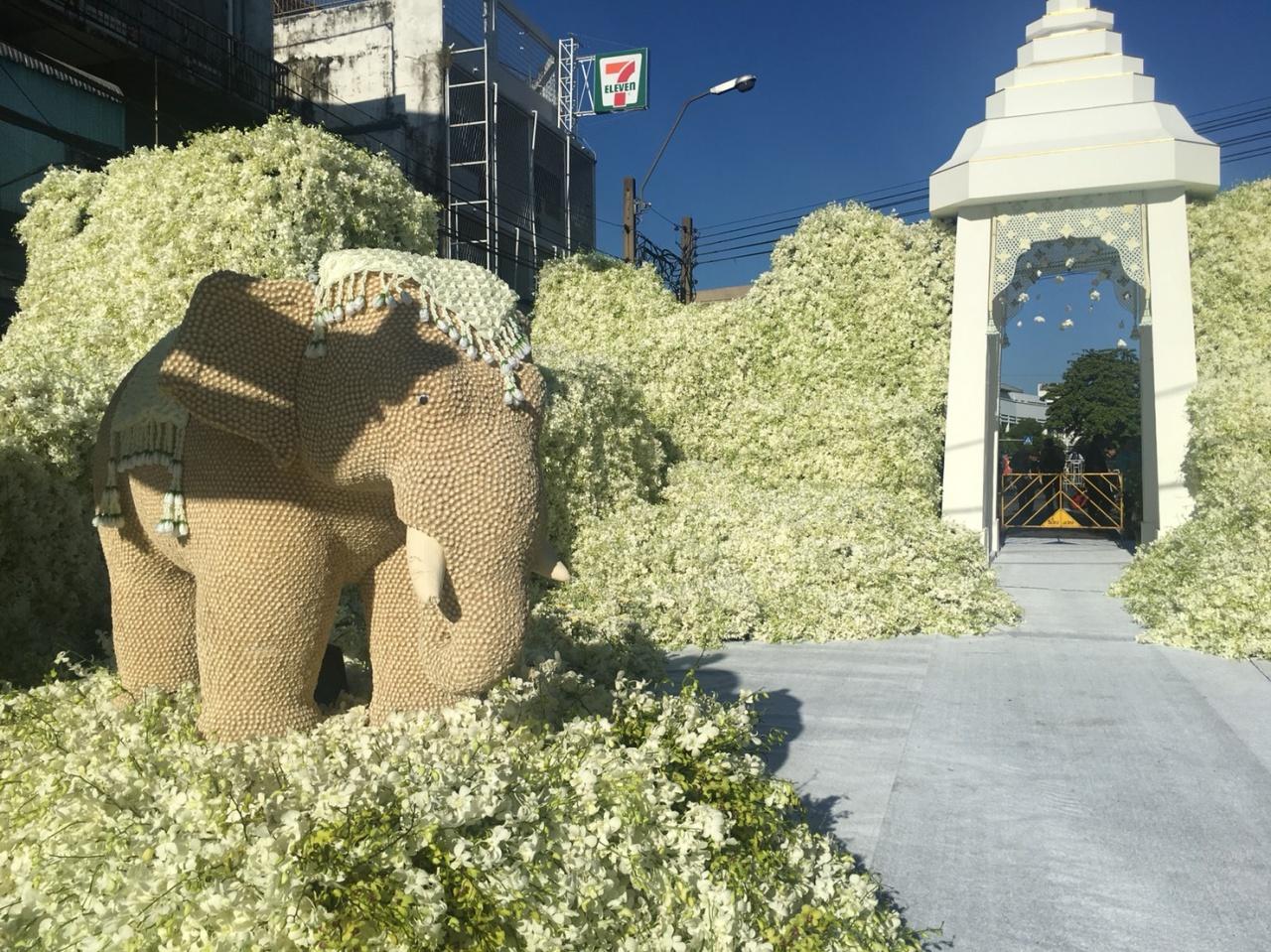 โดยตลอดถนนจักรเพชร ปากคลองตลาด ตั้งลานปฐมบรมราชานุสรณ์ รัชกาลที่ 1 จนถึงสถานีตำรวจนครบาลพระราชวัง จะถูกตกแต่งด้วยดอกไม้นานาชนิด โดยจัดเป็นซุ้มดอกไม้ รวม 6 ซุ้ม ที่สื่อความหมายถึงความรัก ความอาลัยของพสกนิกรไทยที่มีต่อในหลวง รัชกาลที่ 9 และแฝงความหมายที่แสดงออกถึงความจงรักภักดี