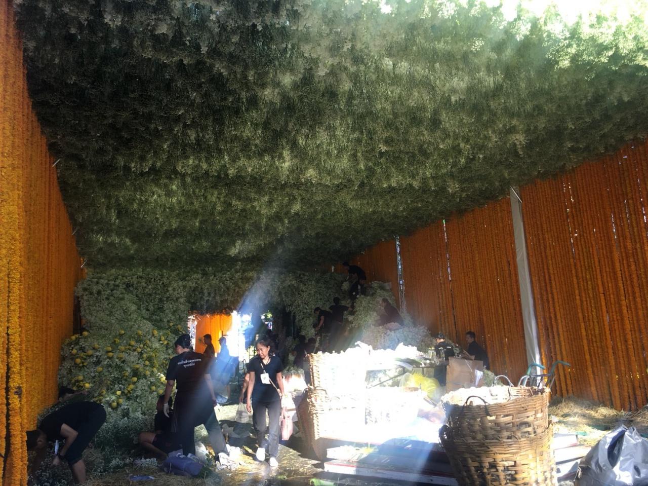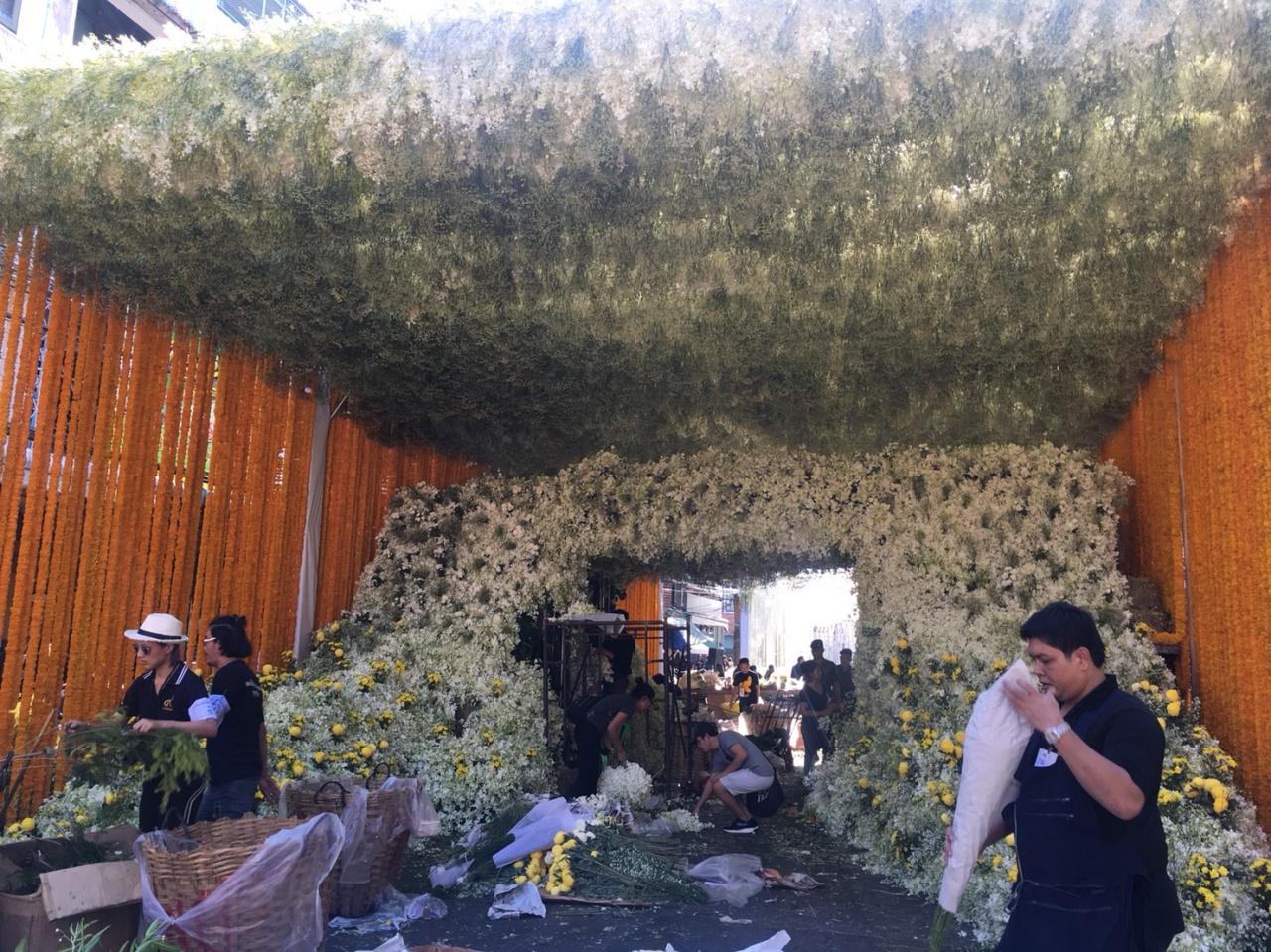 วันที่ 21 ตุลาคม กลุ่มจิตอาสาและชาวปากคลองตลาดหลายพันคน ต่างช่วยกันนำดอกเรือง มาประดับตกแต่งเป็นซุ้มดอกไม้ เพื่อประดับอุโมงค์ดอกไม้ในงาน “ดอกไม้เพื่อพ่อ” ซึ่งดอกดาวเรืองเหล่านี้ส่วนหนึ่งได้รับการสนับสนุนจากชาวปากคลองตลาด และกลุ่มชาวเขาเผ่าม้ง จำนวน 51 คน ที่เดินทางมากจากอำเภอพบพระ จังหวัดตาก นำมามอบให้ และร่วมตกแต่งดอกดาวเรืองที่ซุ้มต้นไม้