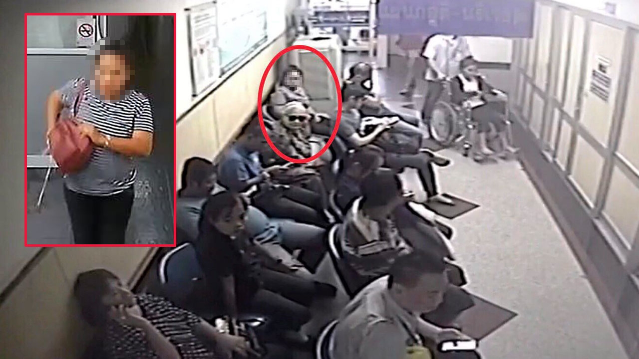 ภาพจากกล้องวงจรปิด รพ.ราษฎร์บูรณะ เผยให้เห็นคนร้ายเป็นหญิง (รูปเล็ก) อ้างเป็นผู้ป่วยรอคิวหมอตรวจ ทำทีตีสนิท น.ส.องุ่น บุญศิลป์ หญิงชราวัย 73 ปี ก่อนเหยื่อเผลอฉกเงิน 8,000 บาท หลบหนี ตร.คาดทำมาหลายที่.