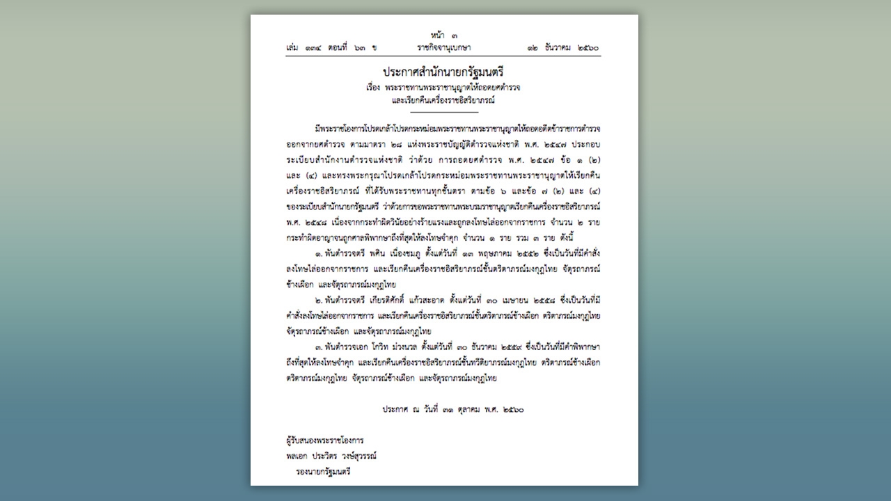 มีพระราชโองการโปรดเกล้าฯ ให้ถอดอดีตข้าราชการตํารวจออกจากยศตํารวจ และทรงพระกรุณาโปรดเกล้าฯ ให้เรียกคืนเครื่องราชอิสริยาภรณ์ เหตุผิดวินัยร้ายแรงถูกไล่ออก 2 รายและต้องโทษจำคุก 1 ราย...