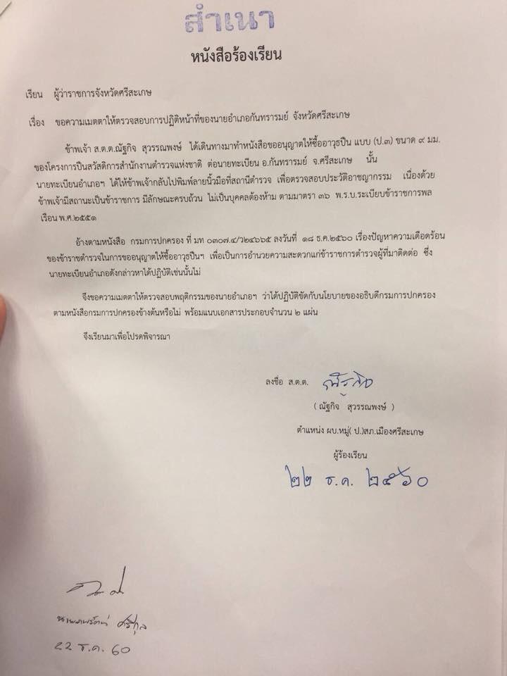 ตำรวจชั้นผู้น้อย ยื่นหนังสือถึงผู้ว่าฯ ศรีสะเกษ ร้องตรวจสอบพฤติกรรมนายทะเบียนอำเภอฯ ภายหลังทำหนังสือขออนุญาตซื้ออาวุธปืนราคาถูกตามสิทธิ์สวัสดิการ กลับถูกไล่กลับไปตรวจสอบประวัติอาชญากรรม ถามย้ำแบบนี้ขัดนโยบายกรมการปกครองไหม?