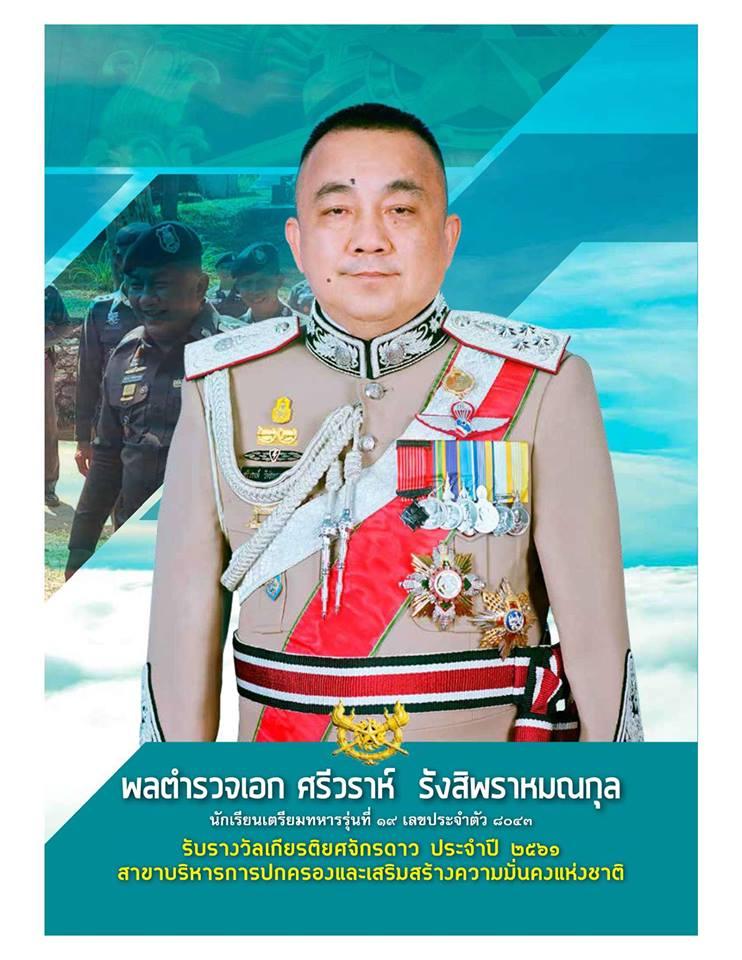 พล.ต.อ.ศรีวราห์ รังสิพราหมณกุล นักเรียนเตรียมทหารรุ่นที่ 19 เลขประจำตัว 8043 รับรางวัลเกียรติยศจักรดาวประจำปี 2561 สาขาบริหารการปกครอง และเสริมสร้างความมั่นคงแห่งชาติ