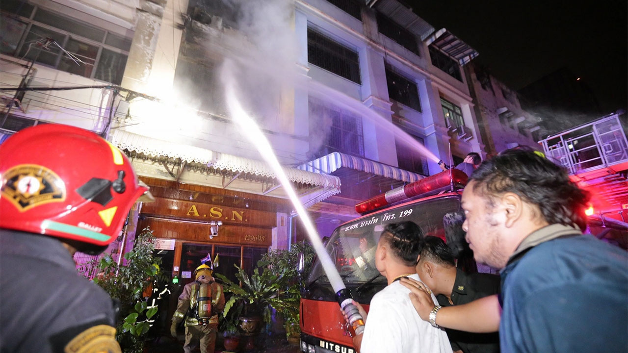 เจ้าหน้าที่ดับเพลิงของสำนักป้องกันและบรรเทาสาธารณภัยกรุงเทพมหานคร ฉีดน้ำสกัดเพลิงไหม้อาคารพาณิชย์สูง 4 ชั้น เปิดเป็นบริษัทรับทำบัญชี ในซอยข้าง ธ.ไทยพาณิชย์ สาขาเตาปูน มี 2 แม่ลูกเสียชีวิตในห้องน้ำชั้น 4 ส่วนสมาชิกครอบครัวบาดเจ็บอีก 3.