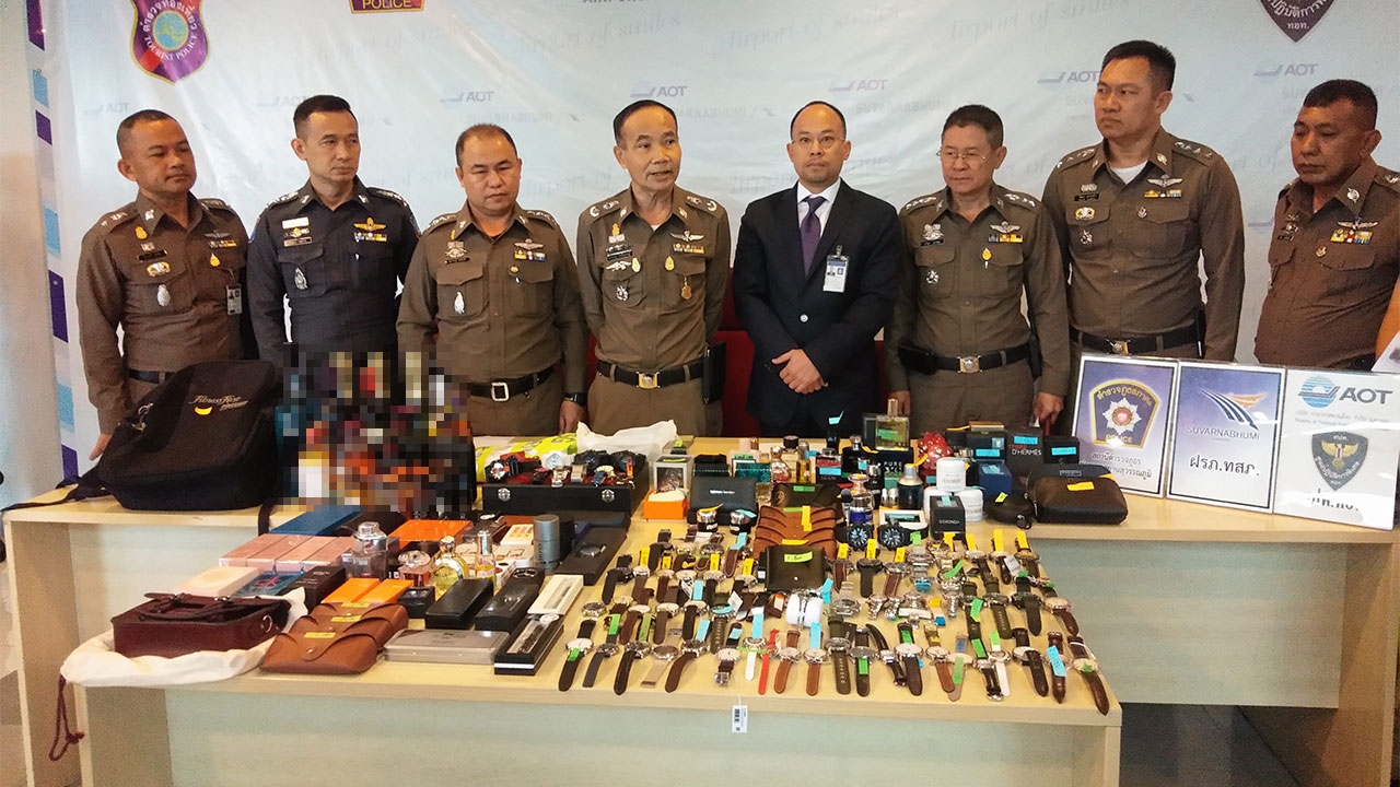 ตำรวจแถลงผลจับกุมนายธวัชชัย เอมโอช พนักงานบริษัท สกายเชฟ ร่วมกับเพื่อนร่วมงานรวม 8 คน ฉวยจังหวะขนถ่ายอาหารขึ้นเครื่องบิน “บริติช แอร์เวย์” ในท่าอากาศยานสุวรรณภูมิ จ.สมุทรปราการ งัดตู้เก็บสินค้าปลอดอากรขโมยของแบรนด์เนมไปขายออนไลน์และใช้ส่วนตัวรวม 12 ครั้ง ของกลางมูลค่ากว่าล้านบาท.