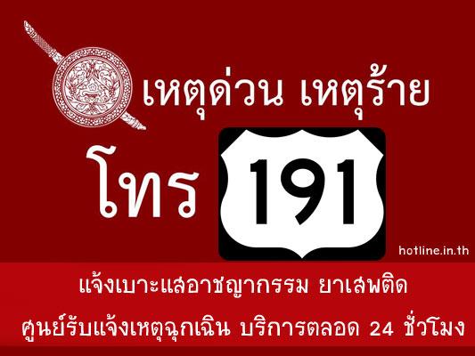 ปัจจุบันประชาชนสามารถกดโทร 191 ได้ทั่วประเทศ โดยตำรวจที่ศูนย์รับแจ้งเหตุจะประสานงานกับตำรวจท้องที่ในจังหวัดนั้นๆ โดยเฉพาะช่วงเทศกาลต่างๆ ตลอดทั้งปี หากประชาชนเดือดร้อน หรือต้องการความช่วยเหลือฉุกเฉิน กด 191 ได้ทันทีครับ