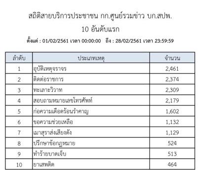 อันดับที่ 1. อุบัติเหตุการจราจร 2,461 ราย 2. ติดต่อราชการ 2,375 ราย 3. ทะเลาะวิวาท 2,309 ราย 4. สอบถามหมายเลขโทรศัพท์ 2,179 ราย 5. ก่อความเดือดร้อนรำคาญ 1,602 ราย 6. ขอความช่วยเหลือ 1,132 ราย 7. เมาสุราเสียงดัง 1,129 ราย 8. ปรึกษาข้อกฎหมาย 524 ราย 9. ทำร้ายบาดเจ็บ 513 ราย และ 10. ยาเสพติด 464 ราย