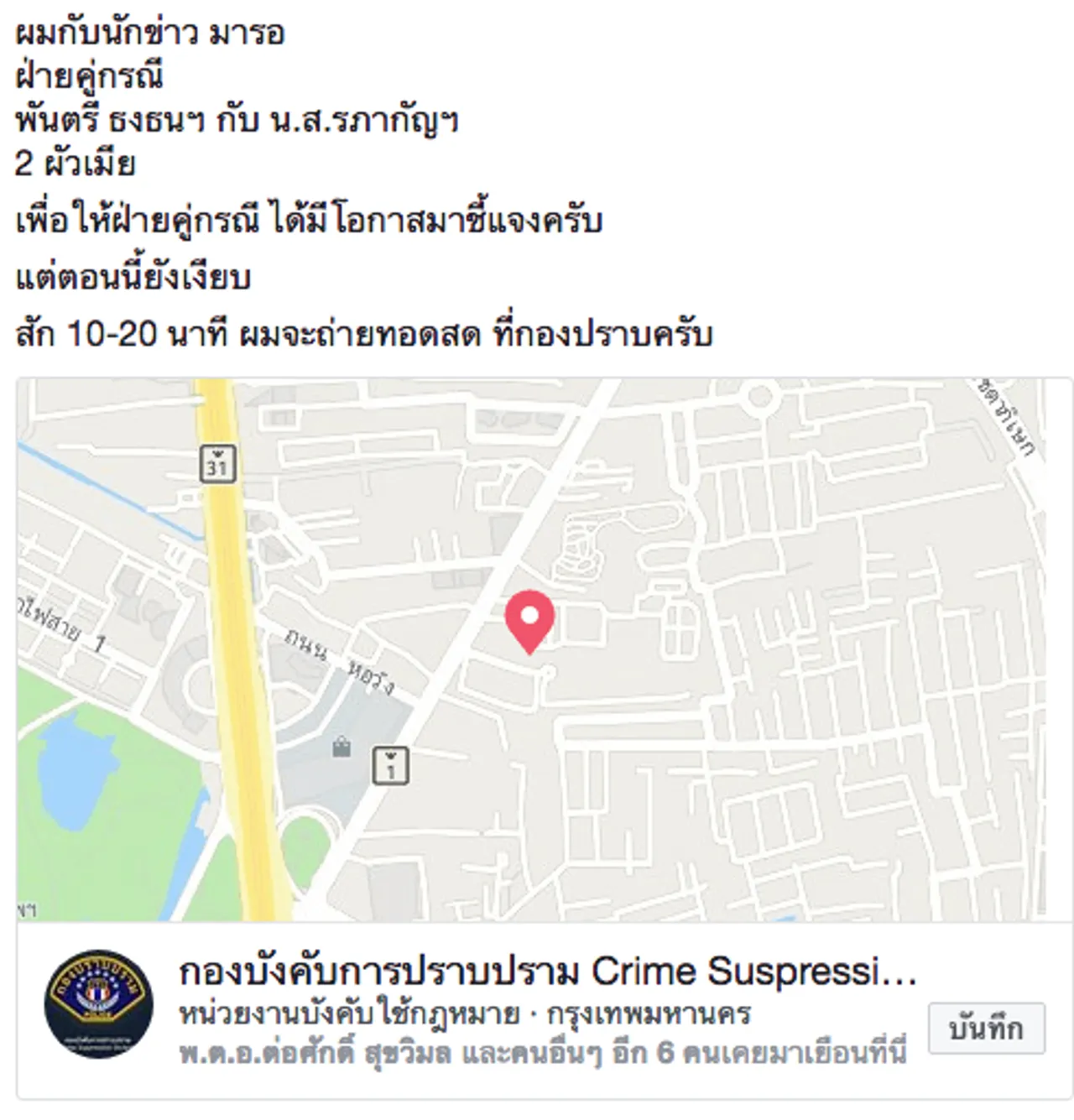 พ.ต.ต.วุฒิพงษ์ ตั้งมหากิจศิริ หรือ สารวัตรชิน เดินทางไปยังกองบังคับการปราบปราม พร้อมกับไลฟ์สดผ่านเฟซบุ๊กส่วนตัว เปิดกล้องเดินถ่ายให้เห็นบริเวณกองกำกับการ 1 และกองกับกับการ 5 เพื่อโชว์ภาพให้เห็นชัดๆ ว่า พันตรี ธงธน มากจันทร์ ทหารสังกัดค่ายสุรสีห์ จ.กาญจนบุรี และ น.ส.รภากัญ มากจันทร์ (ภรรยา) เพื่อนสนิทร่วมรุ่นนักเรียนเตรียมทหาร ไม่ได้มาตามที่นัดไว้ตอน 14.00 น วันนี้ เจอกันที่กองปราบ!